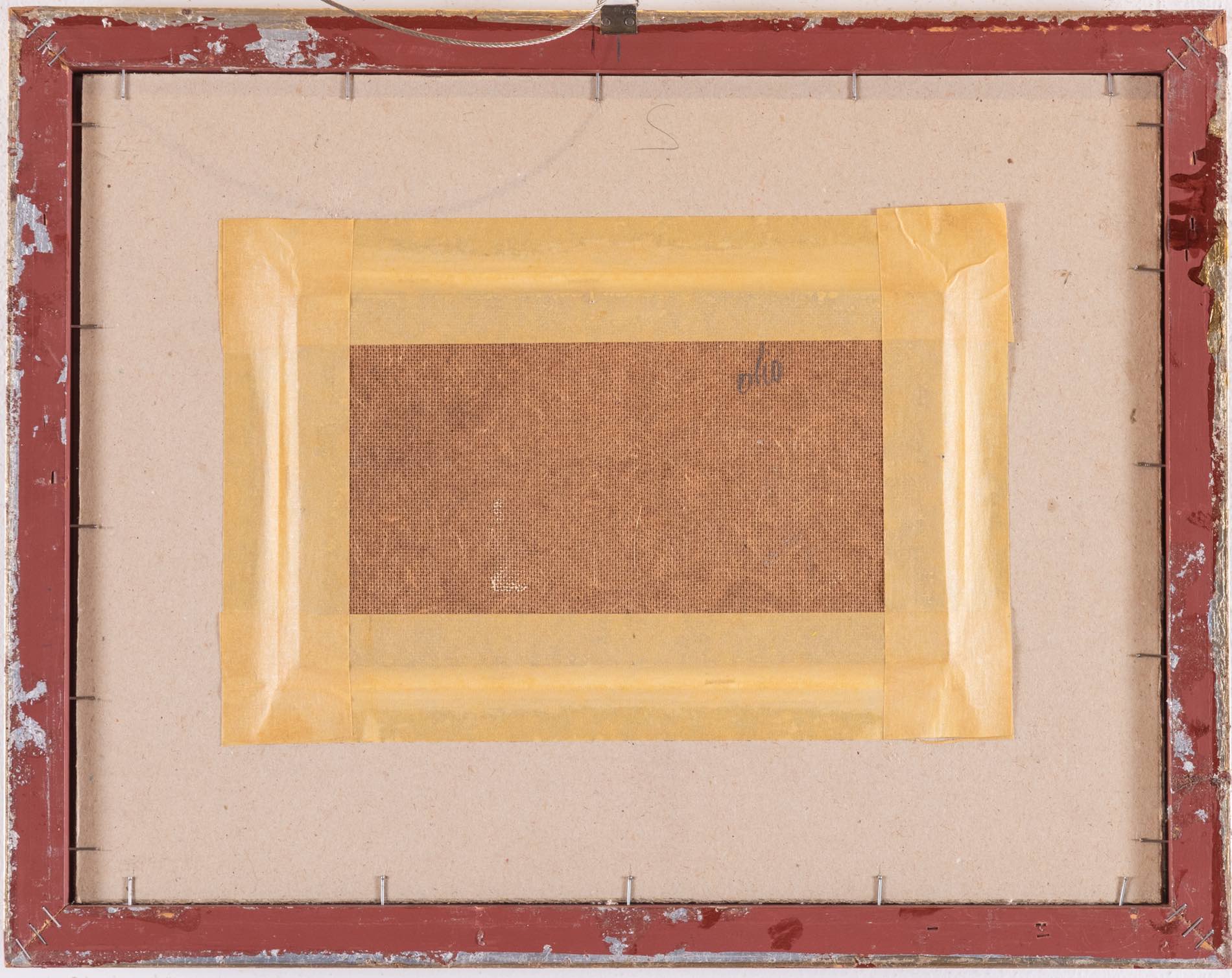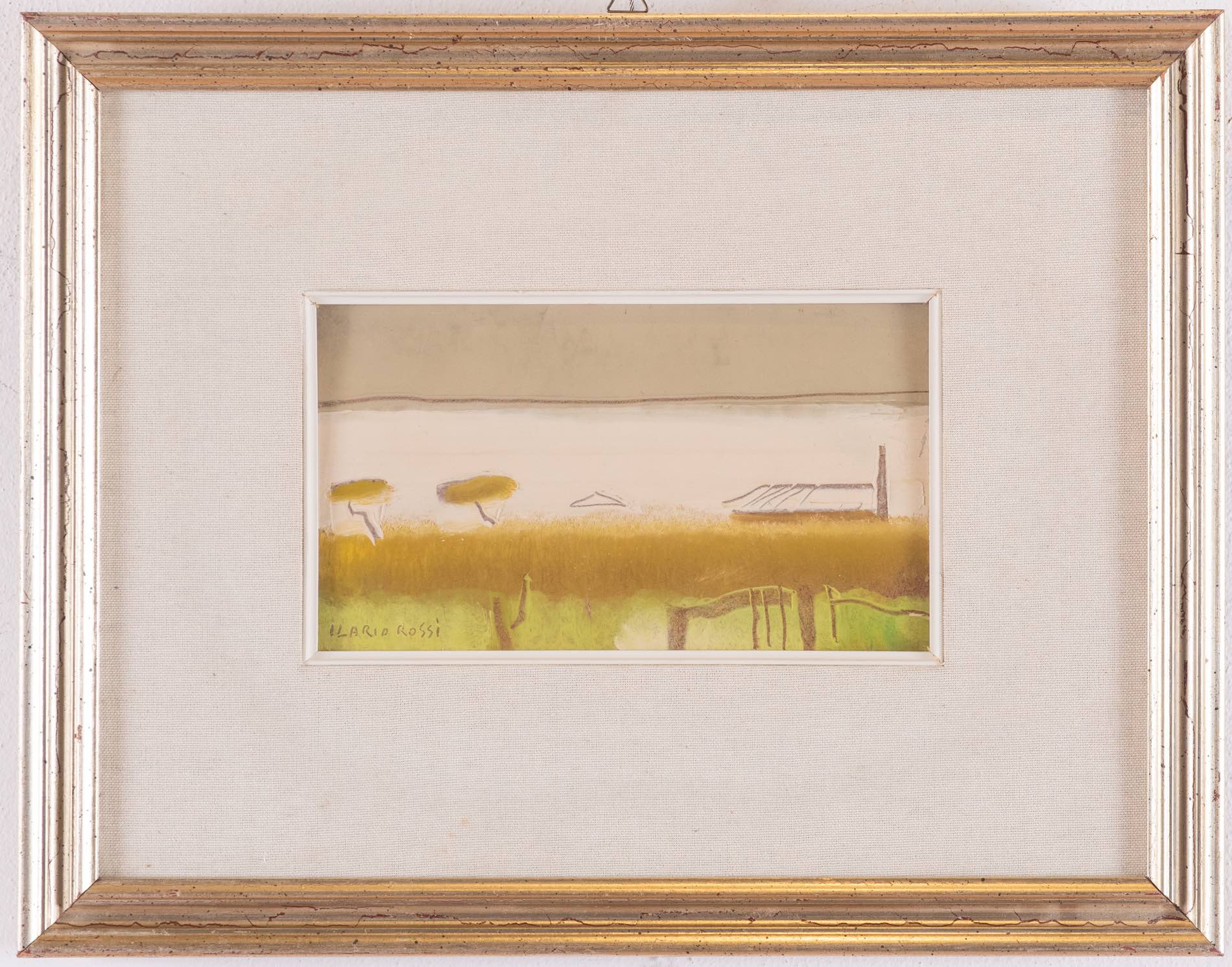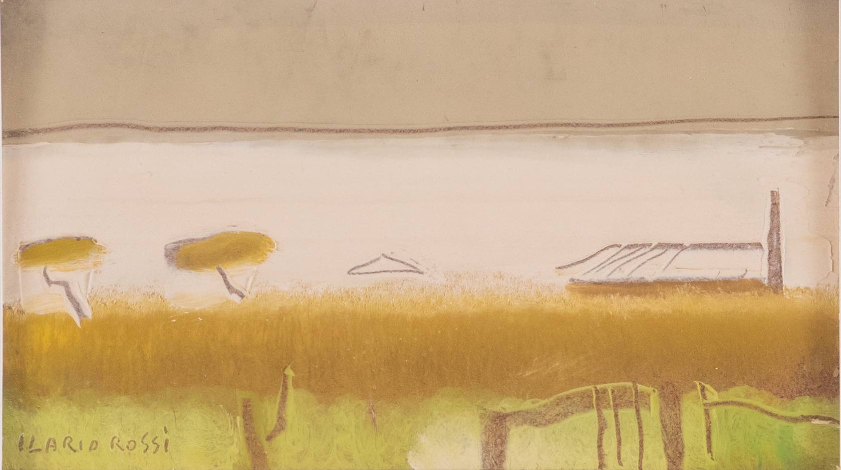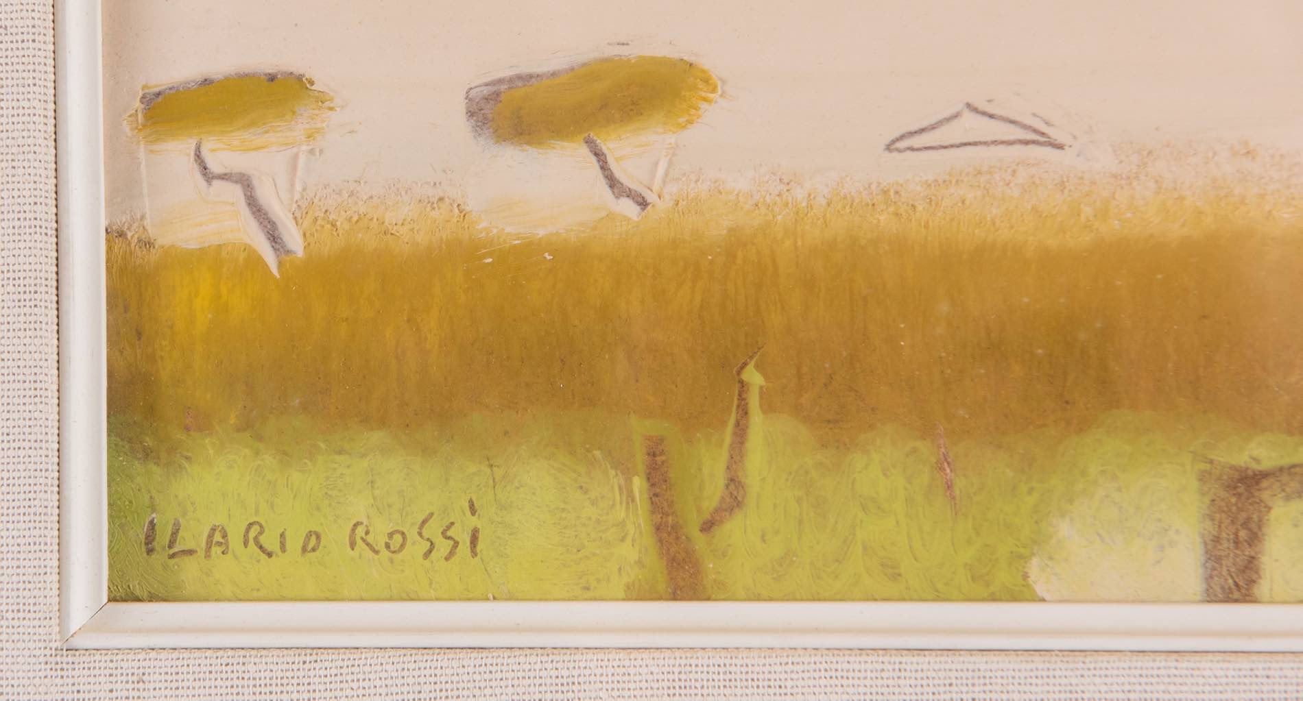 Ilario Rossi (Bologna 1911 - 1994), “Paesaggio”. Olio su faesite, firmato in basso a sinistra Ilario Rossi, reca al retro iscrizione 'olio', H cm 14.5x25 - con cornice H cm 37x47