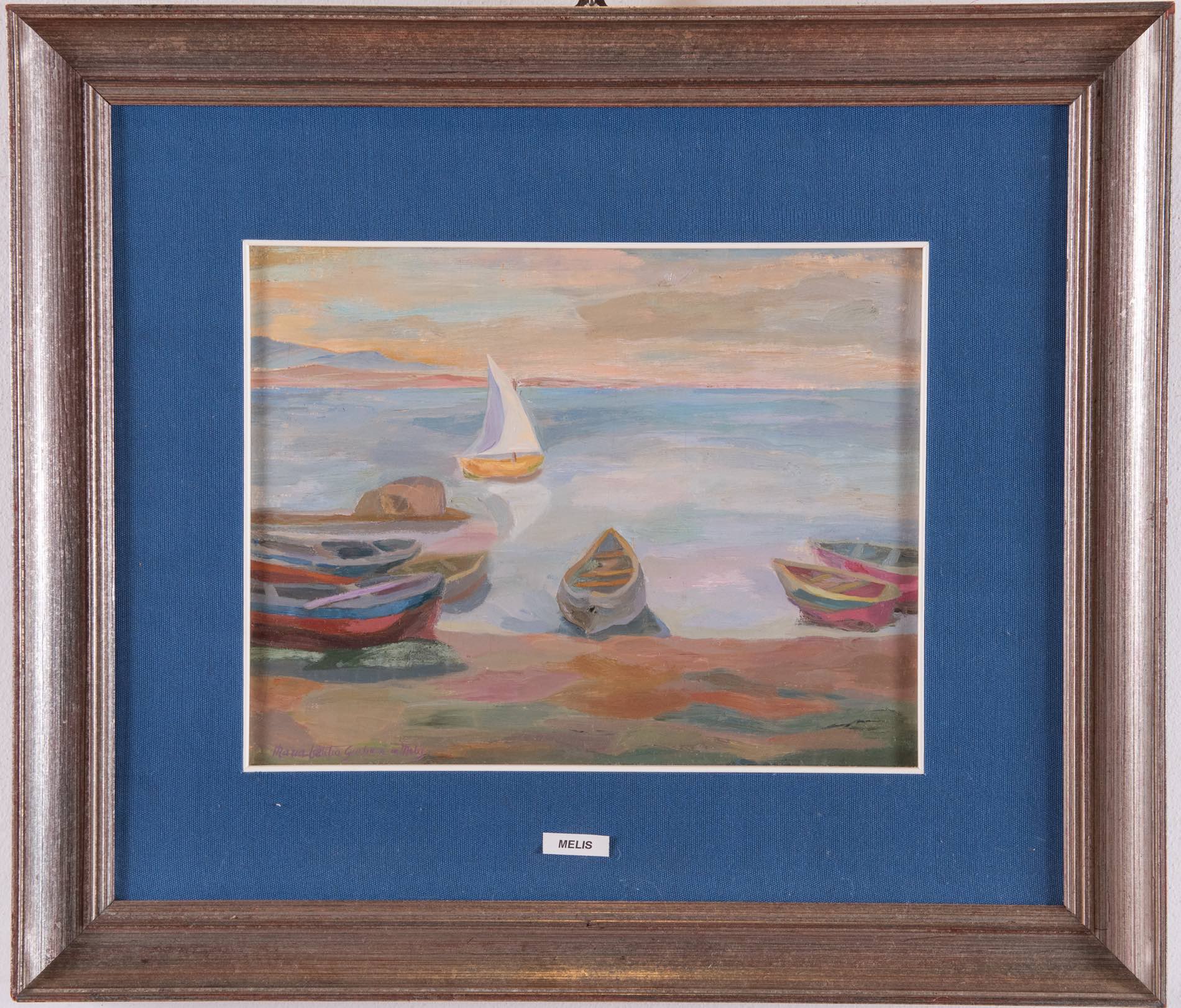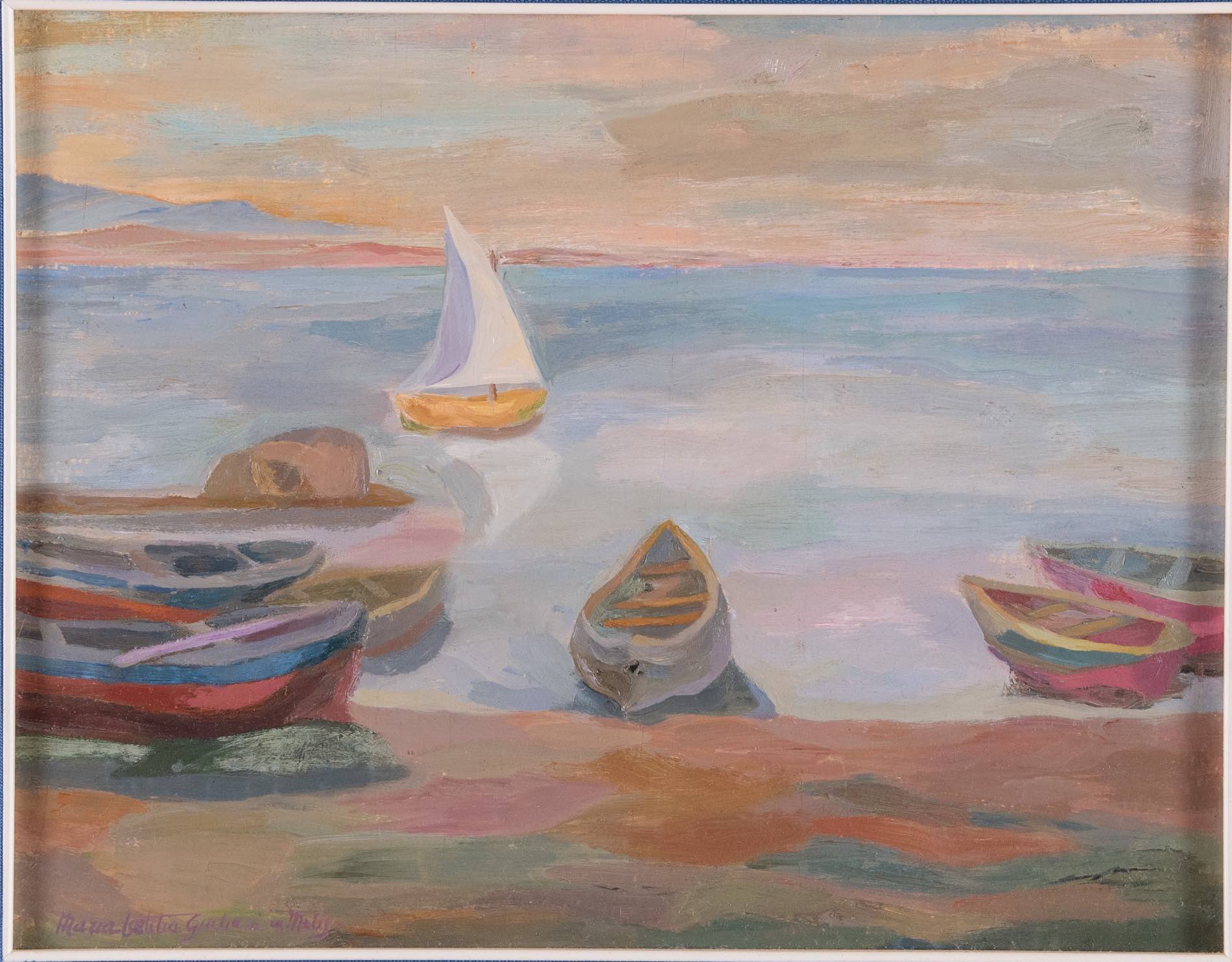 Maria Letizia Giuliani in Melis (Roma 1907 - 1985), “Paesaggio con barche”. Olio su tavoletta, firmato in basso a snistra Maria Letizia Giuliani in Melis, H cm 30x39 - con cornice H cm 55x63.5
