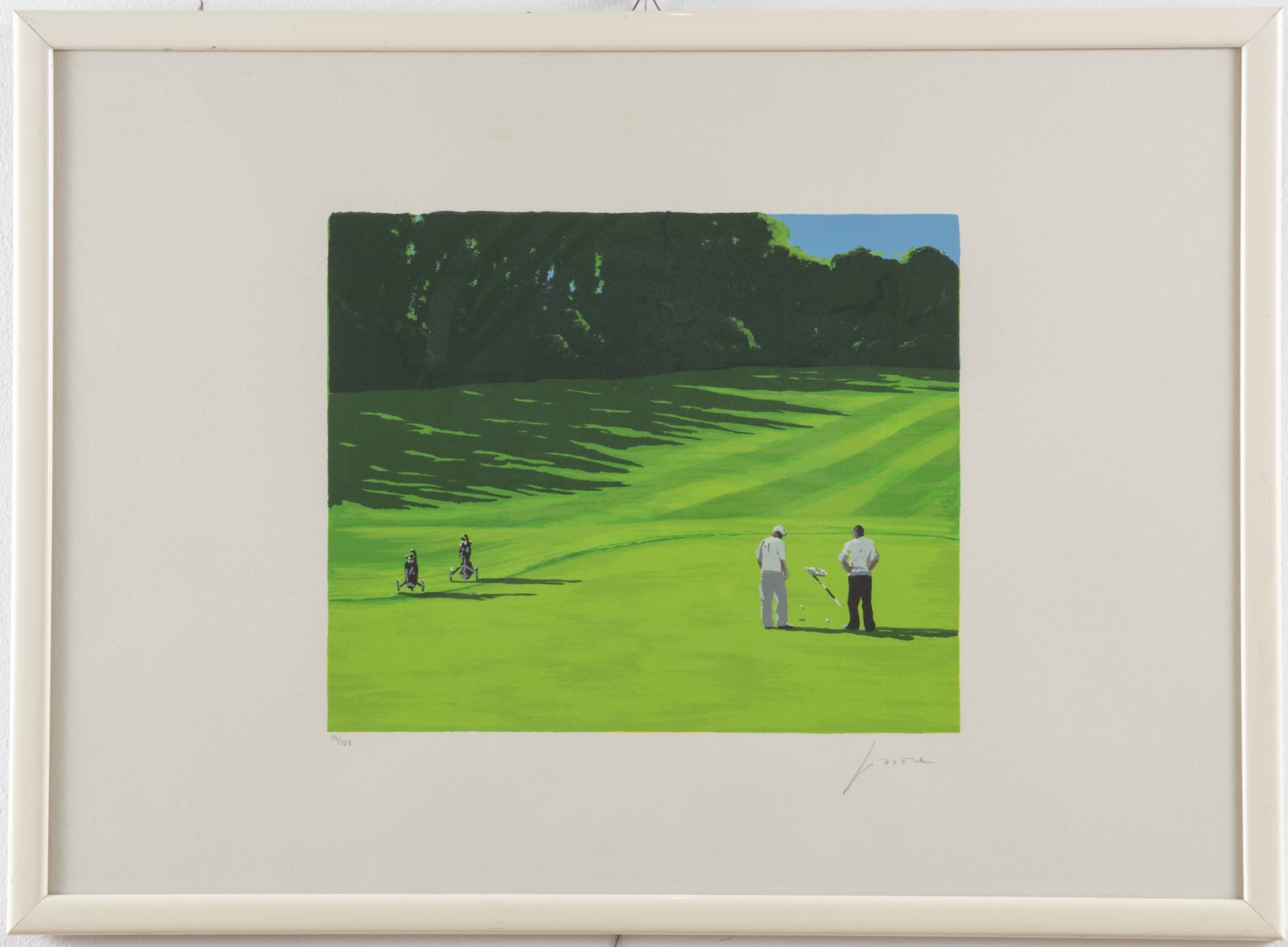 Daniele Fissore (Savigliano 1947), “Panorama campo da golf”. Serigrafia a colori su carta, firmata in basso a destra Fissore, numero di tiratura in basso a sinistra 14/125, Lastra H cm 30x37 - Foglio H cm 50x70