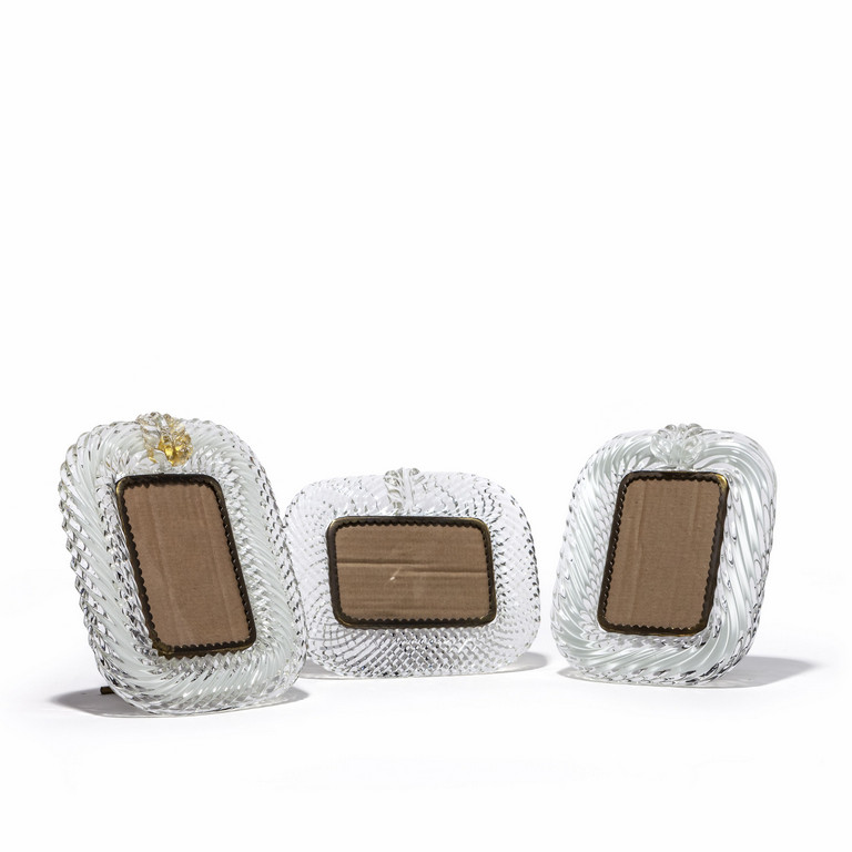 Un tris di portaritratti in cristallo ritorto e ottone due sono decorati con una canna sommersa lattimo.