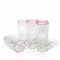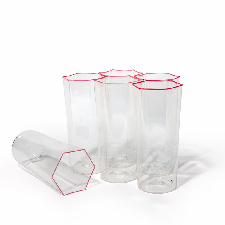 Un gruppo di sei bicchieri esagonali in vetro trasparente con bordo rubino circa 1925.