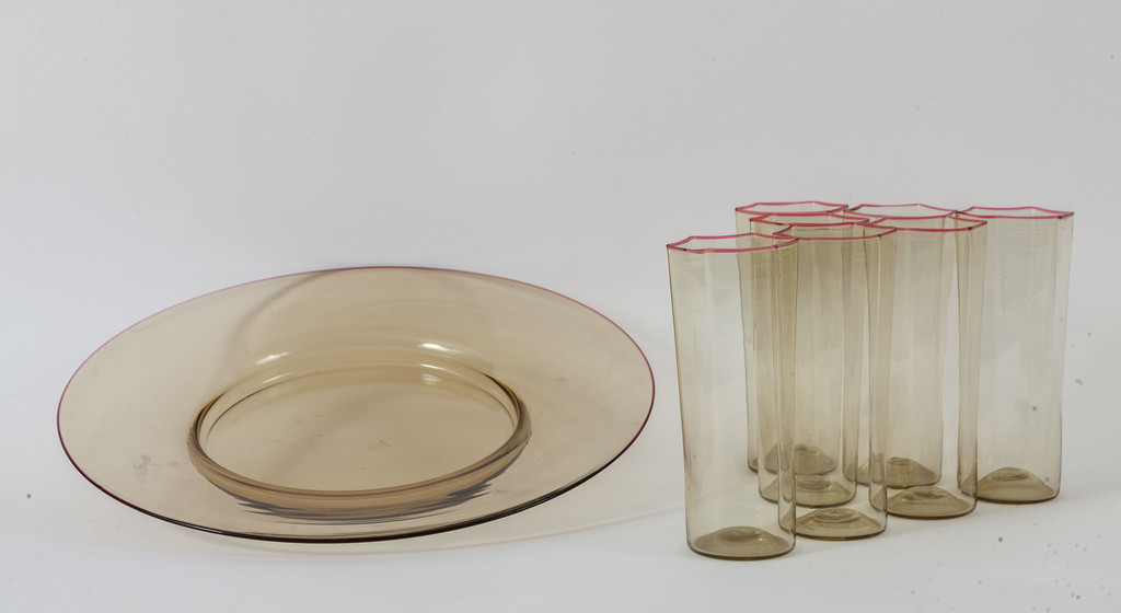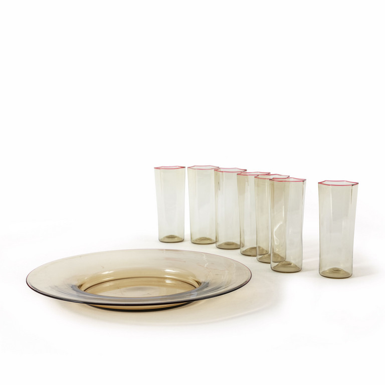 Un piatto e sette bicchieri ambrati esagonali a bordo rubino.