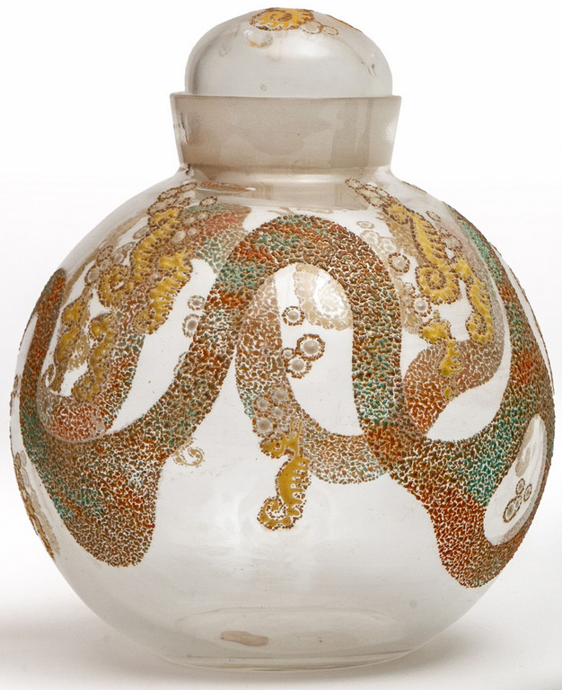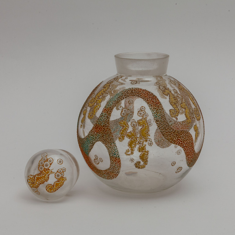 Un vaso globulare con tappo in cristallo decorato a smalti policromi circa 1948.
