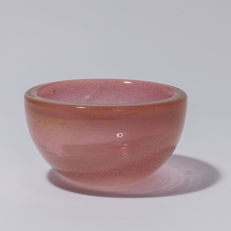 Una coppa circolare in vetro rubino a bollicine e foglia oro 1937.
