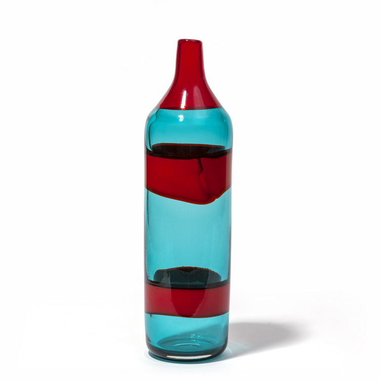 Una bottiglia in vetro trasparente verde decorata sul corpo da due fasce orizzontali rosse e collo rosso trasparente circa 1950.
