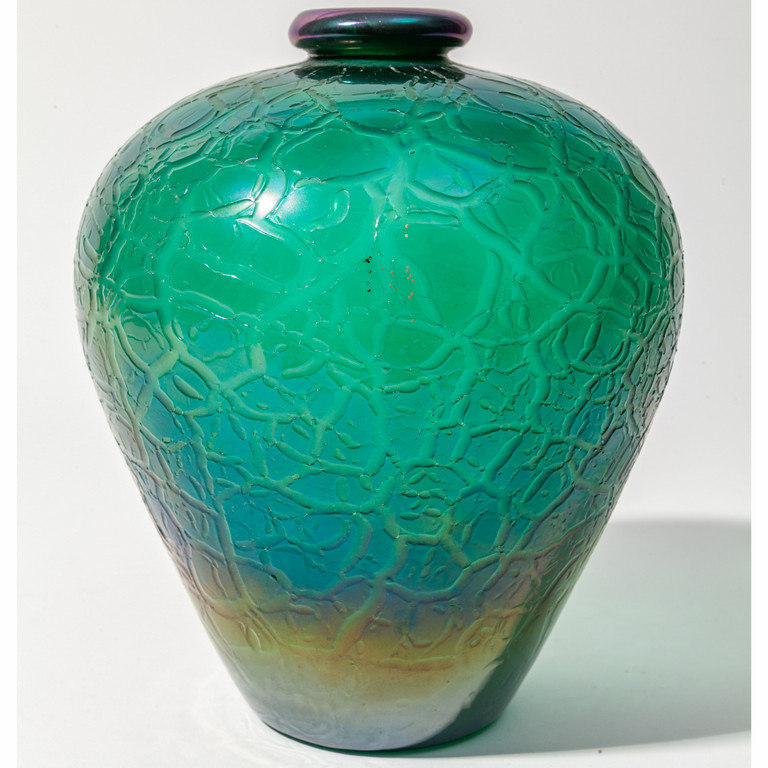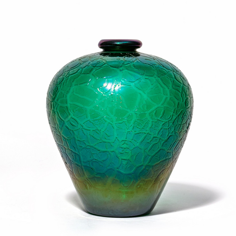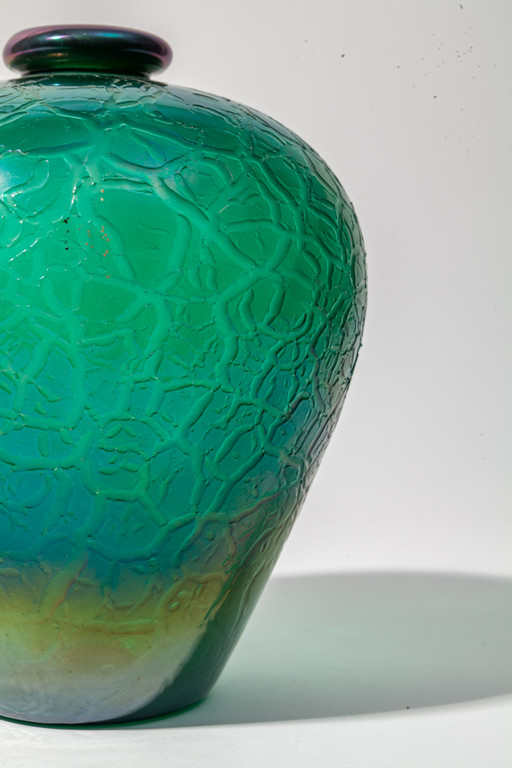 Un vaso in vetro verde iridato a craquele' circa 1925.