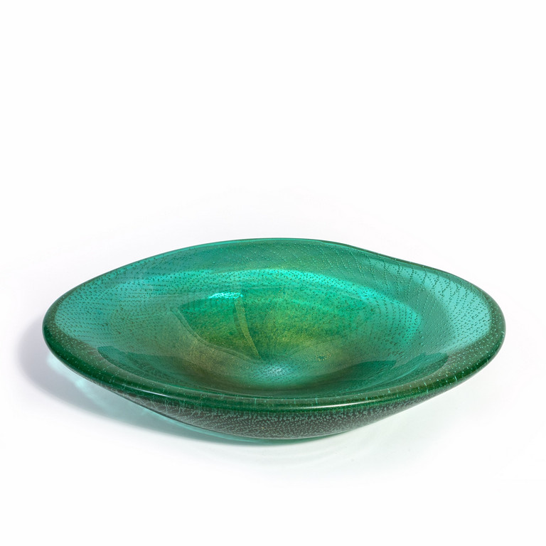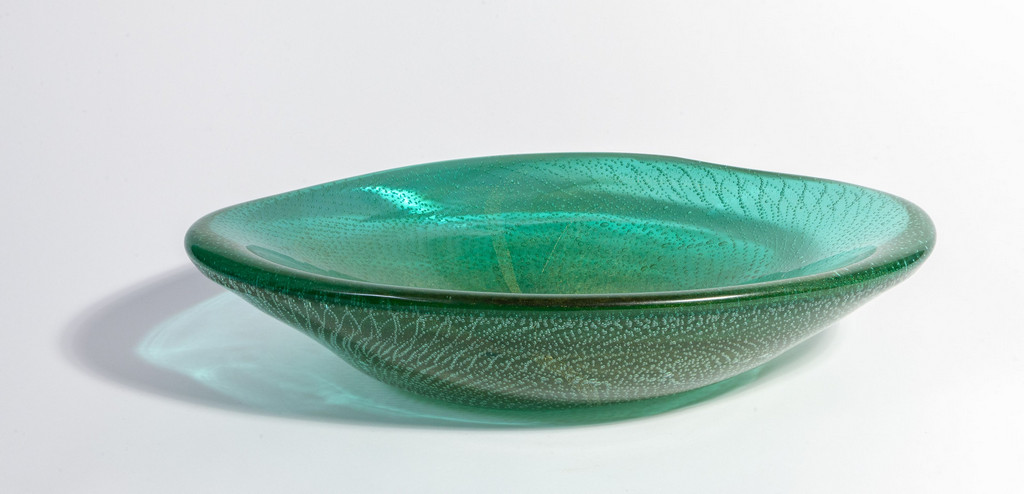 Una coppa ovale in vetro verde trasparente bullicante e foglia oro circa 1937.