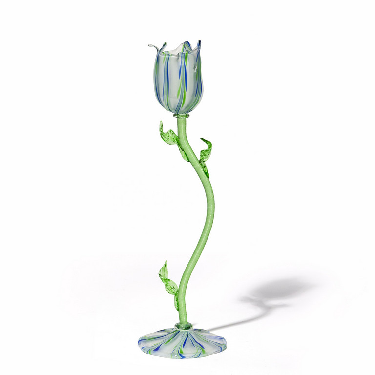 Un tulipano in vetro opalino con striature colorate e stelo in vetro verdino con tre foglie applicate inizio '900.