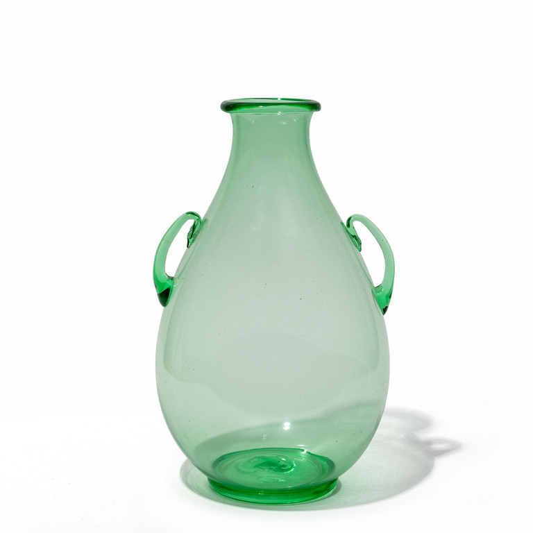 Un vaso in vetro verdino trasparente con due piccole anse applicate circa 1925.
