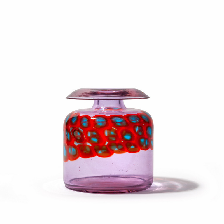 Un vaso in vetro alessandrite con decoro a fascia di murrine rosso-azzurre circa 1965.