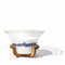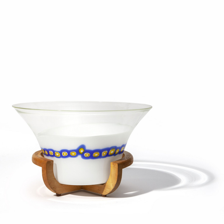 Una grande coppa in vetro lattimo e cristallo con fascia orizzontale di murrine gialle e blu poggiante su supporto in legno curvato circa 1970.