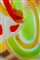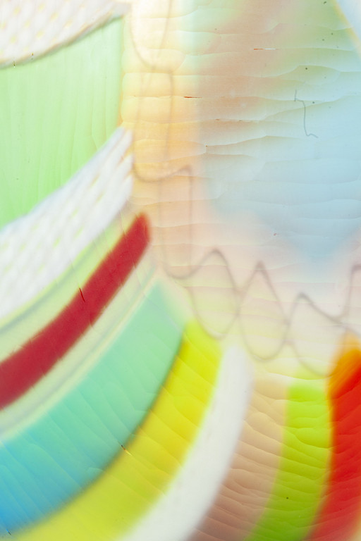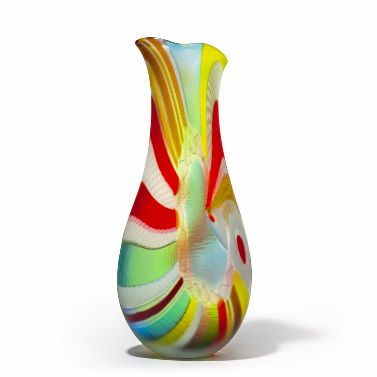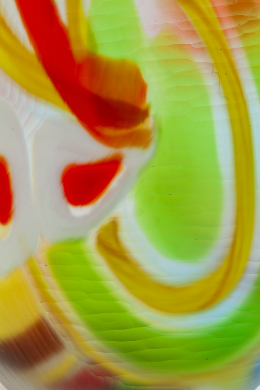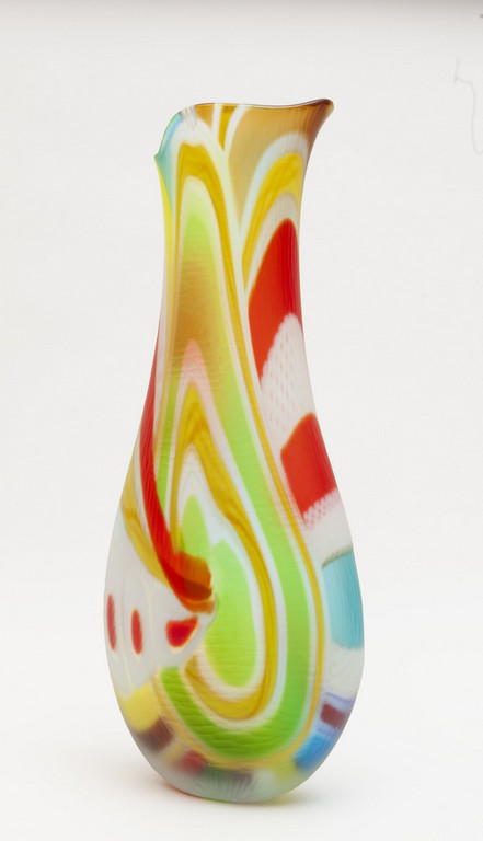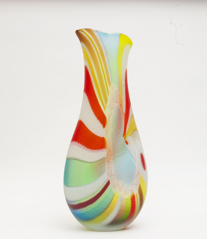 Un vaso in vetro a macchie colorate e reticello lattimo completamente lavorato alla mola circa 2015.