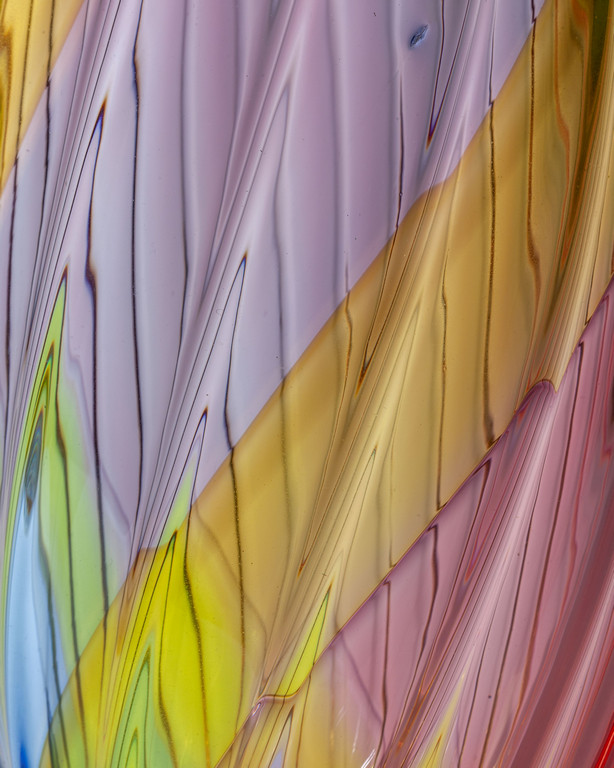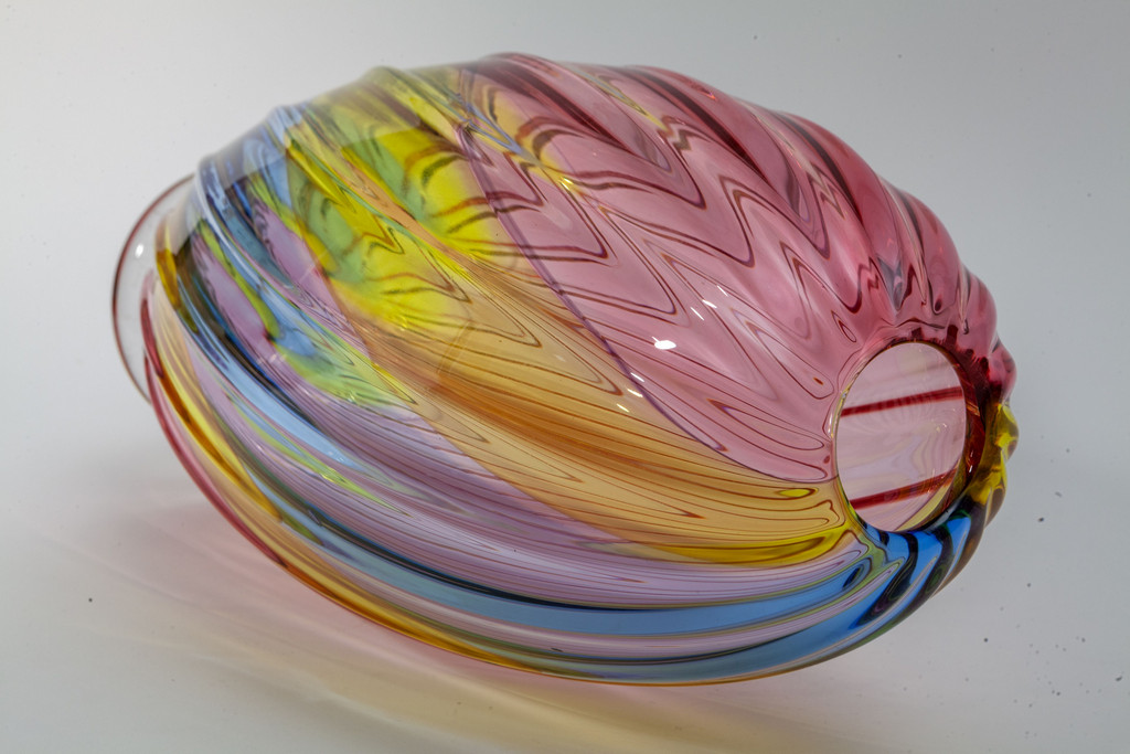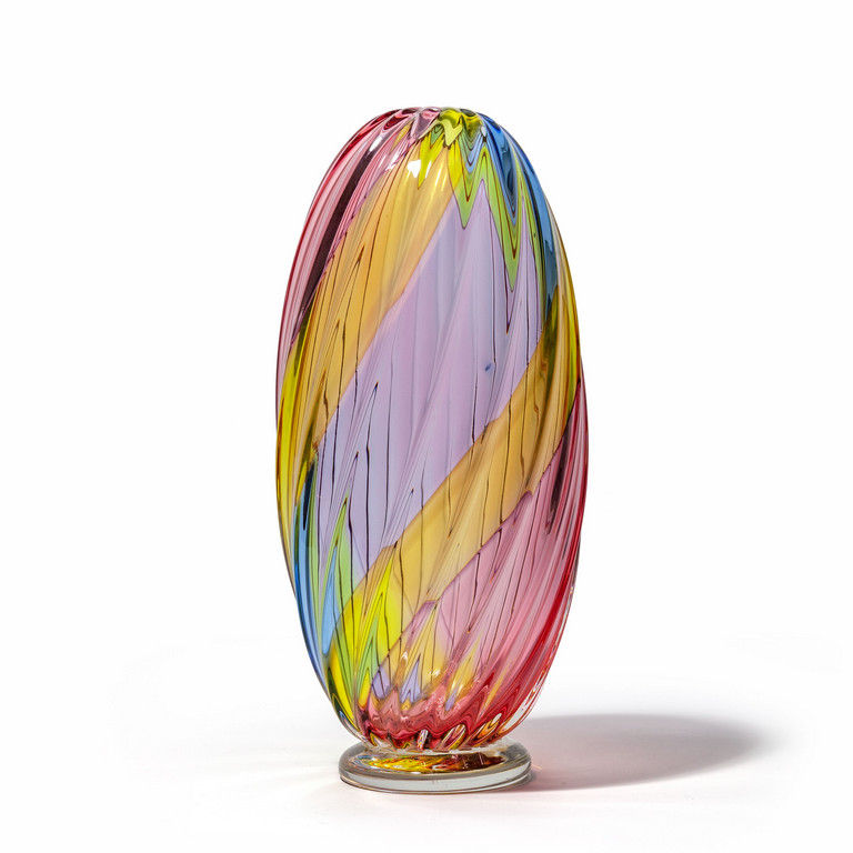 Un vaso 'carnevale' a forma ovale in vetro trasparente giallo rubino e azzurro circa 2000. Marca incisa 'antonio seguso murano'.