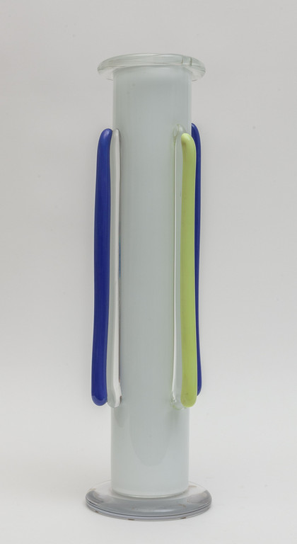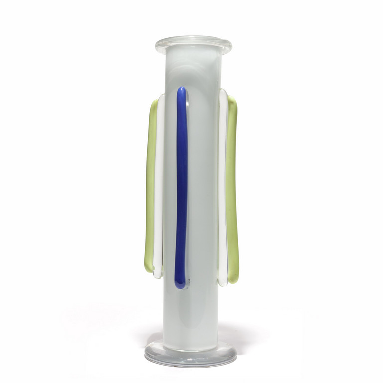 Un vaso 'sempre piu' nel mezzo' della serie 'rovine' cilindrico in lattimo con cordoni gialli e blu applicati a caldo 1992.