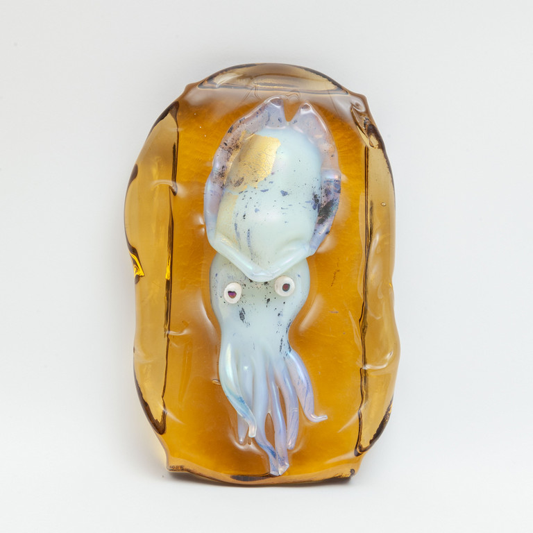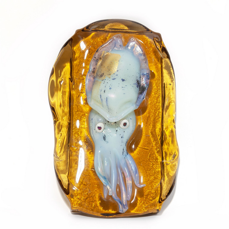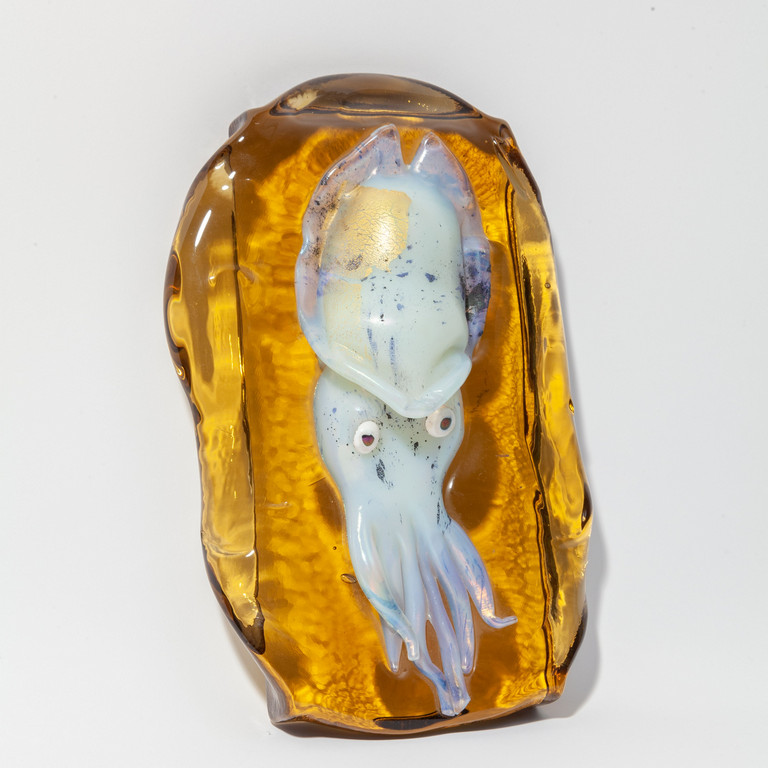 Un acquario ambra con calamaro opalino azzurro iridato e foglia oro circa 1970.