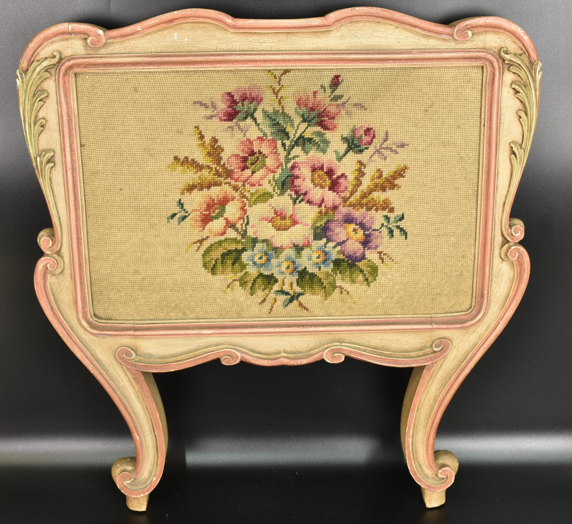 Lotto 82 | COPRICAMINO copricamino in legno con pannello in stoffa ricamata a motivo...