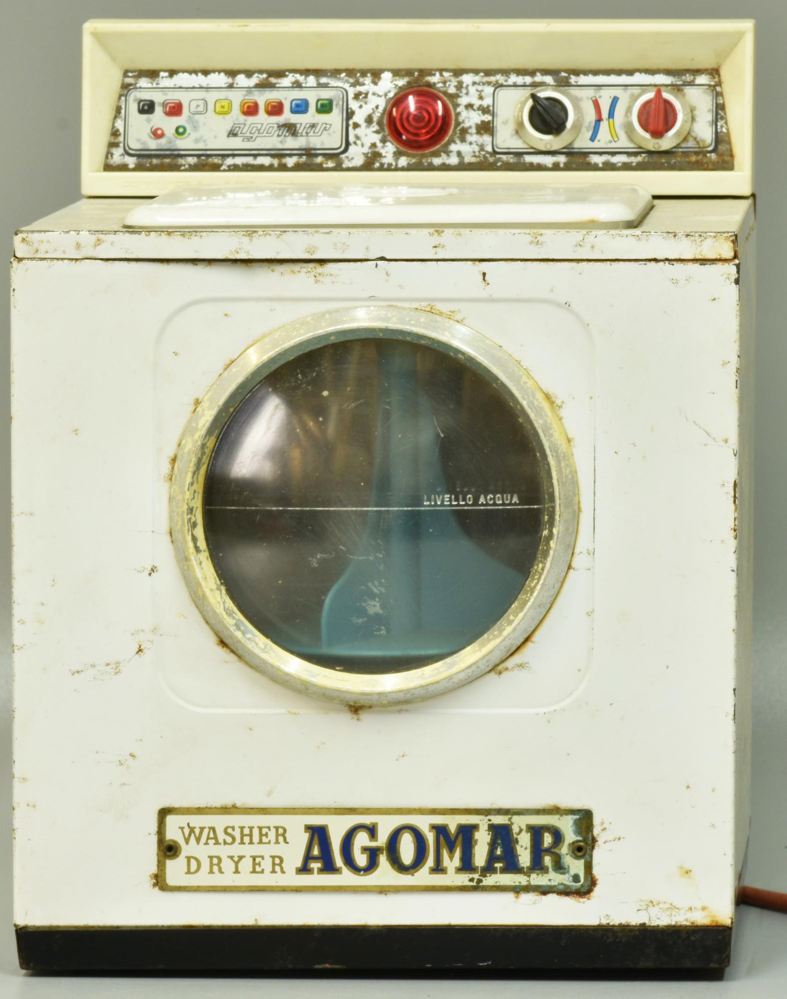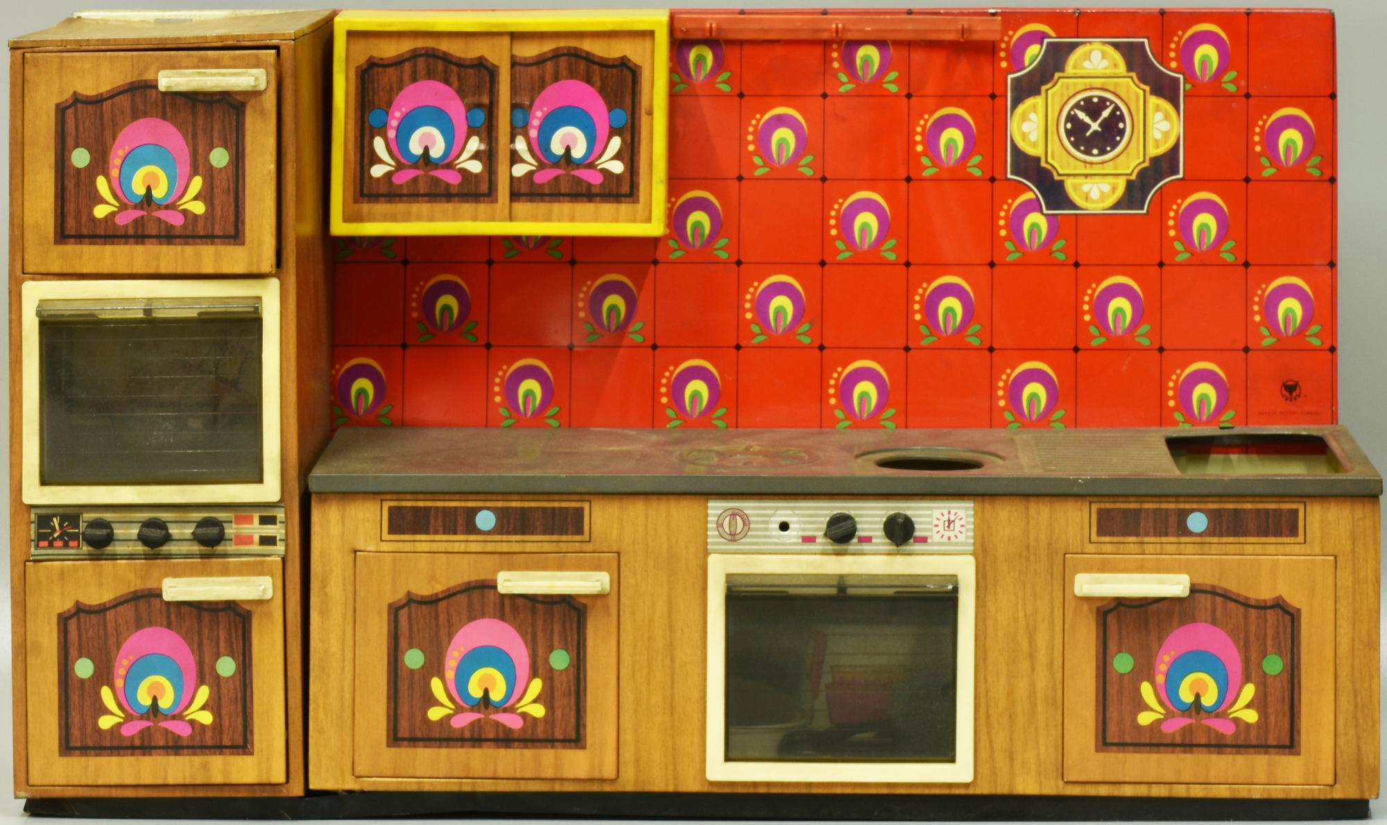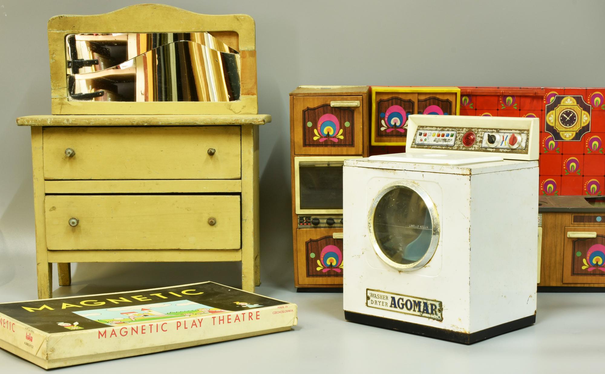 comprende gioco da tavolo Magnetic Theatre di cm 20x33, cassettiera con specchio in legno di cm 45x30, cucina in plastica di cm 51x30 e lavatrice in plastica di cm 26x20