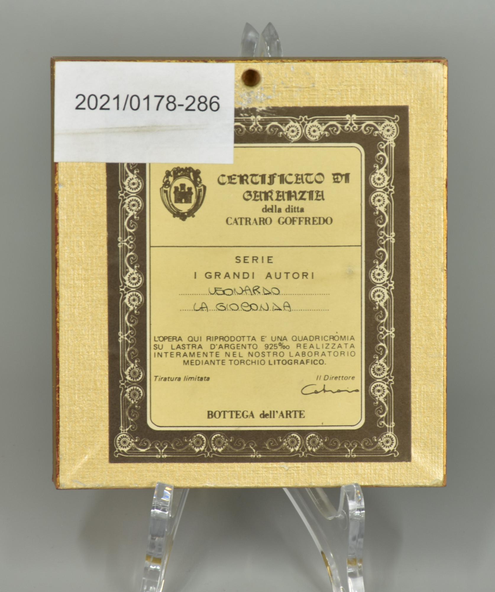 francobollo commemorativo raffigurante la Gioconda di Leonardo, quadricromia su lastra d'argento 925, esemplare 4/500