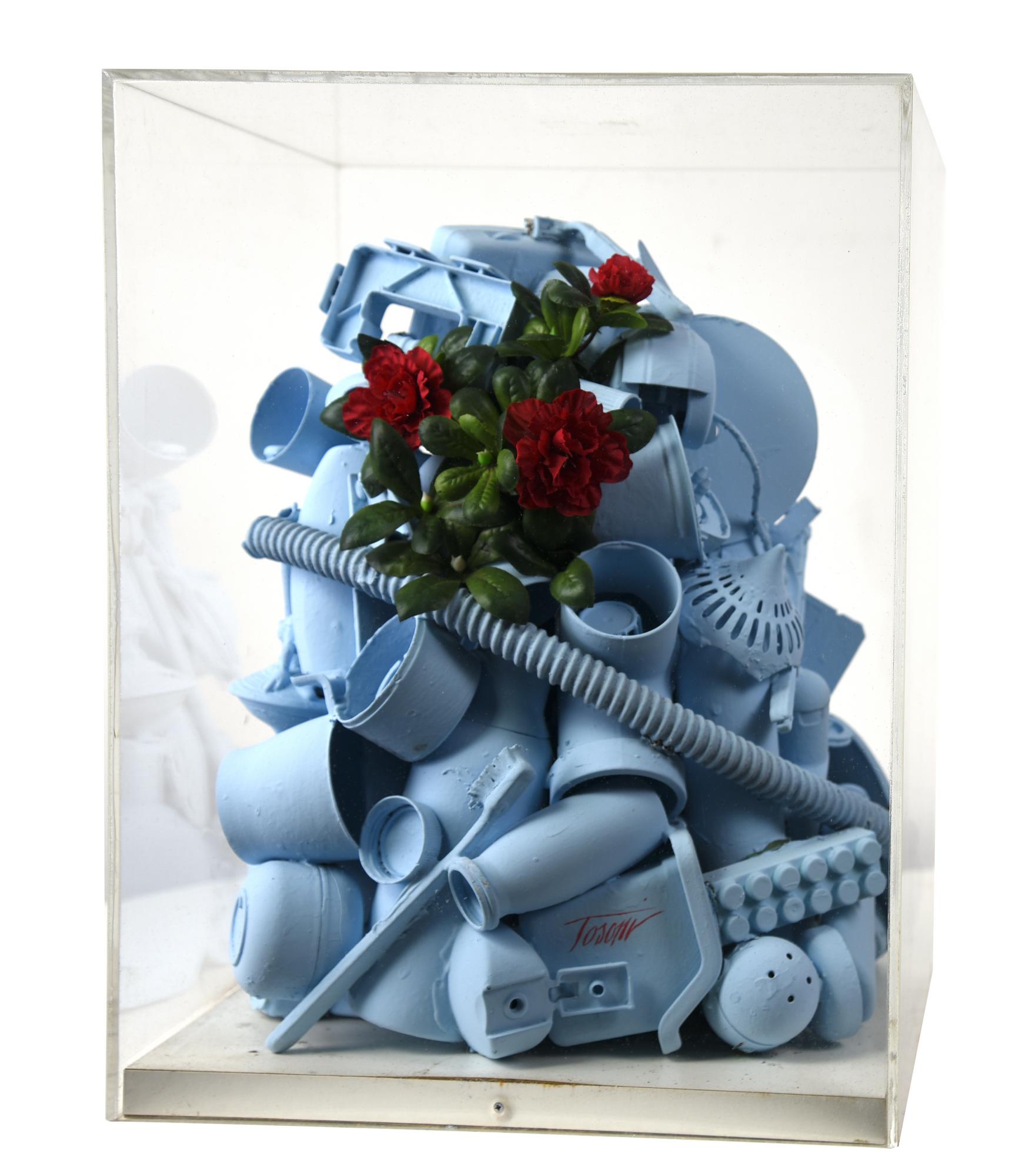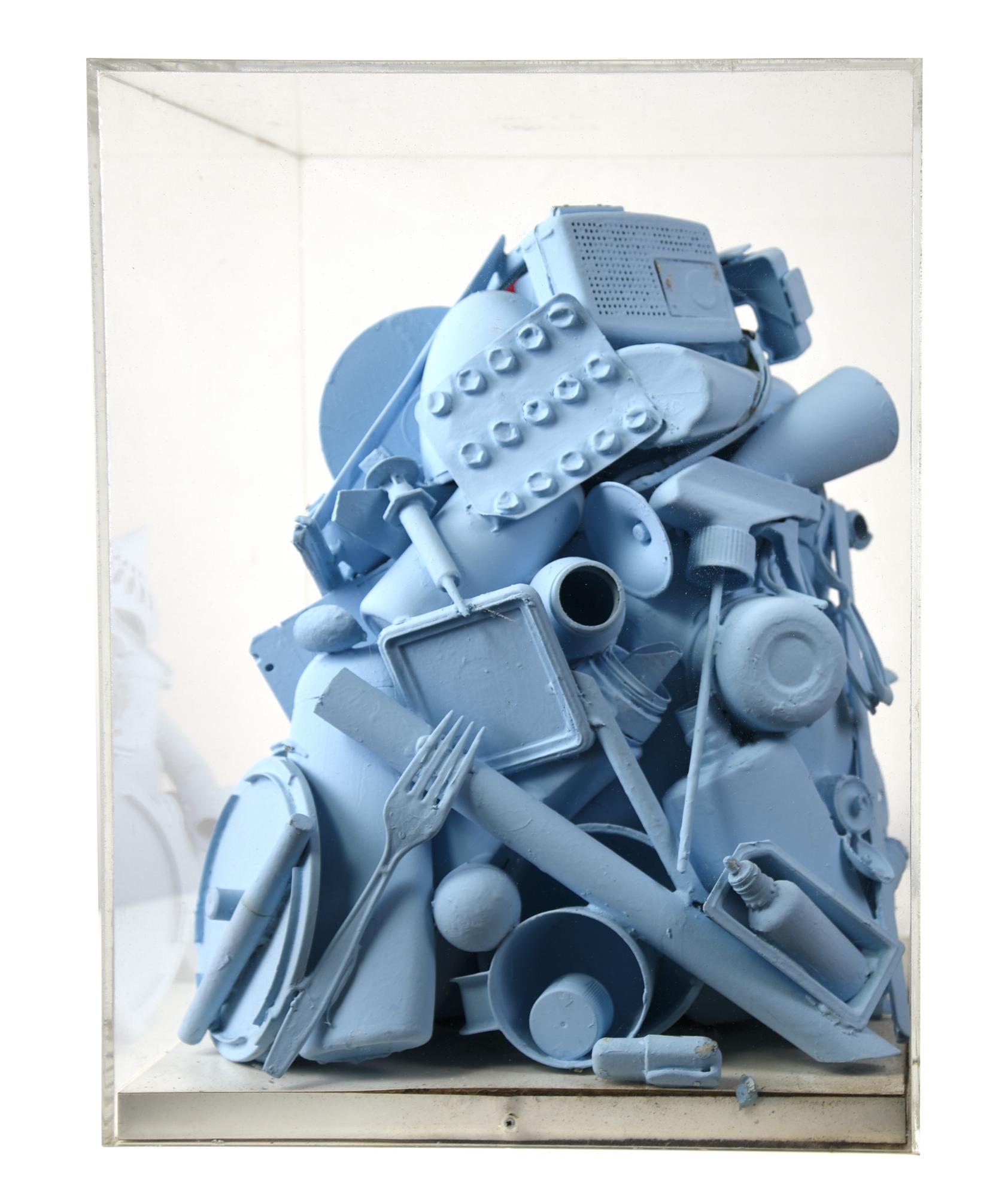 accumulazione di materiale plastico e acrilico, entro teca in plexiglass, cm 47,5x36x36