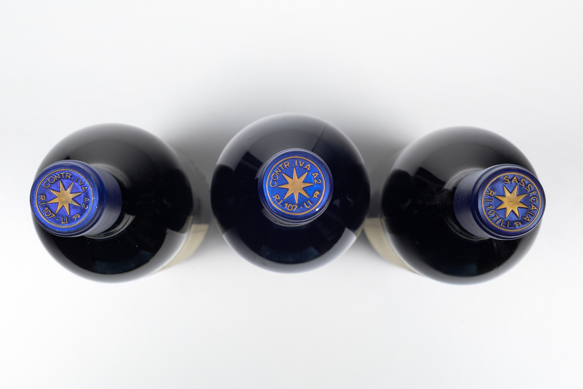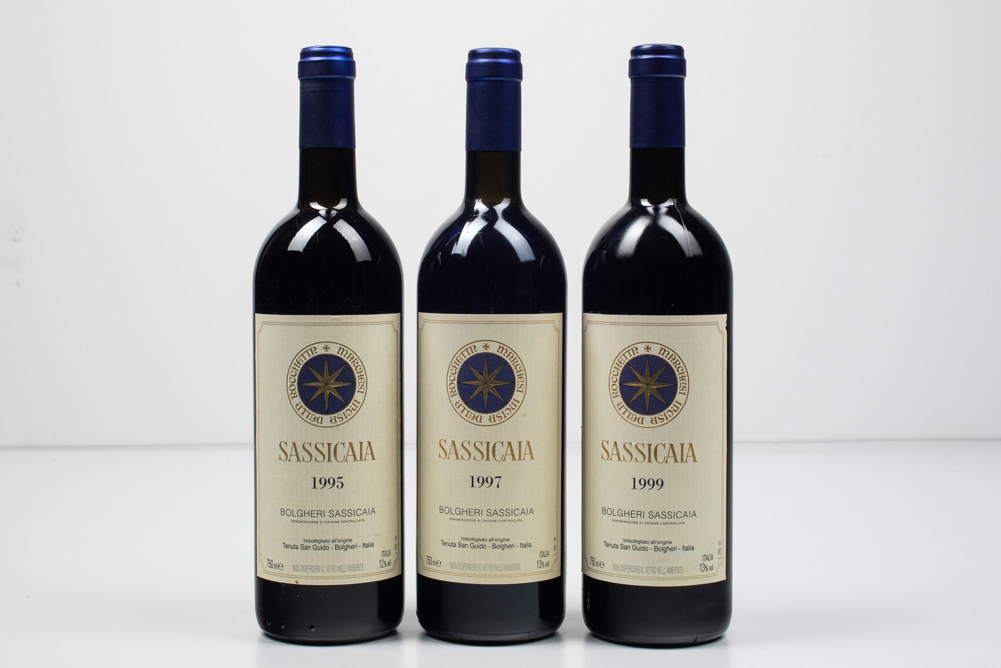 Tenuta San Guido, Sassicaia, (3 Bts), 1995, 1 Bt BN, 1997, 1 Bt BN, 1999, 1 Bt BN, (etichette e capsule con segni d'usura del tempo)