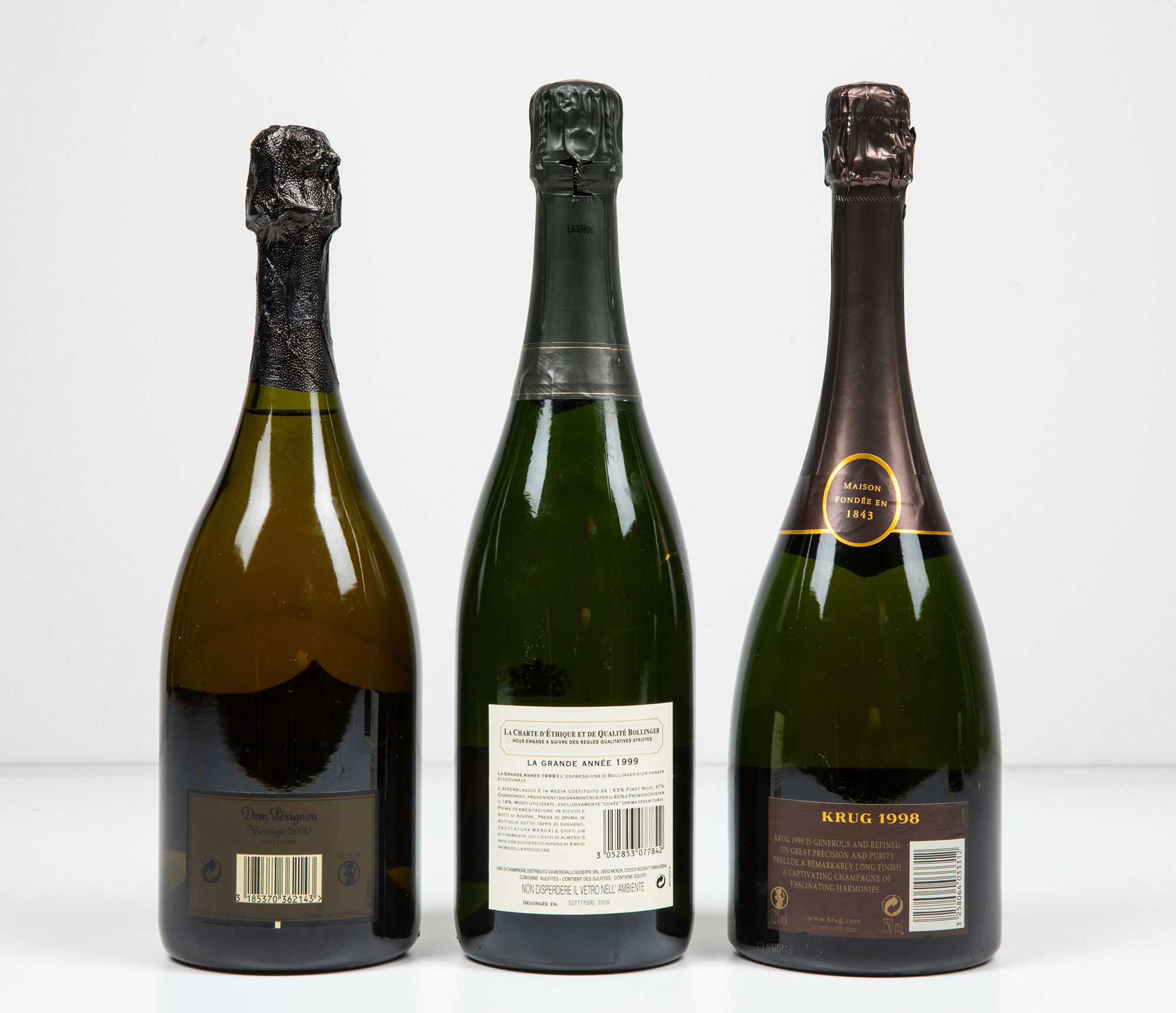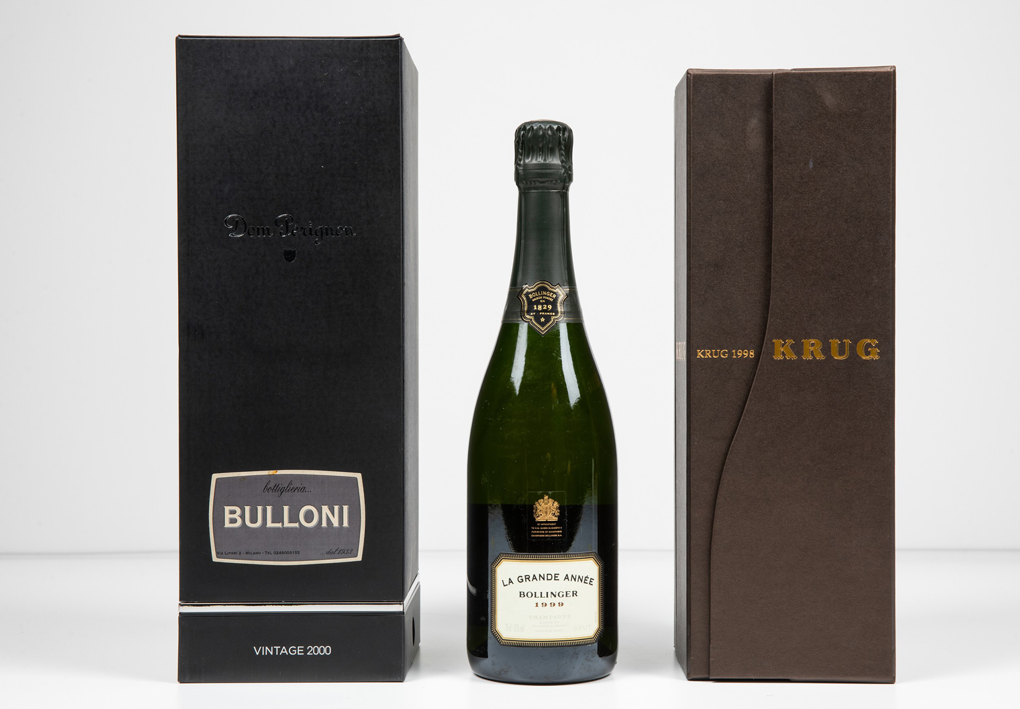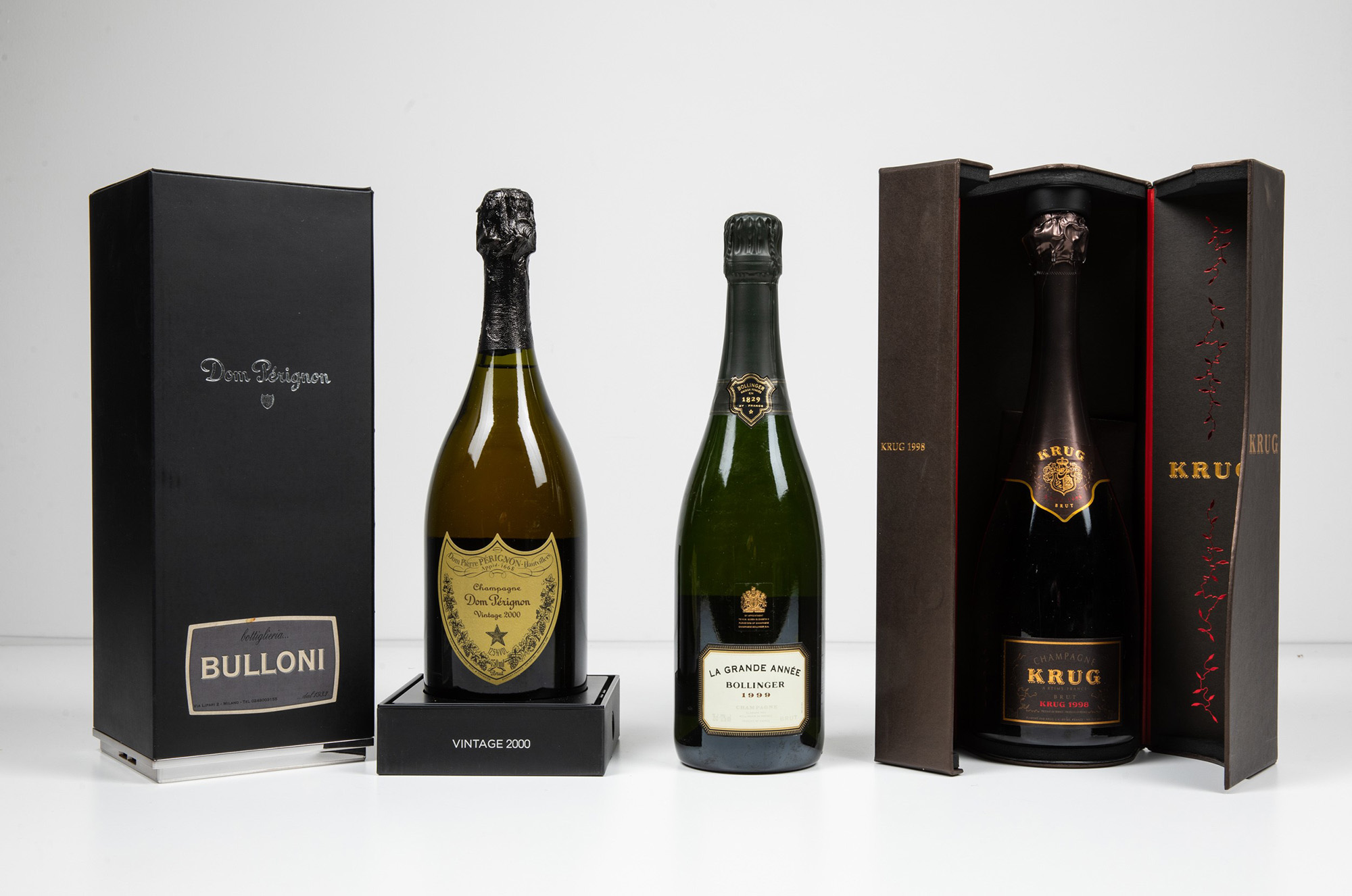 Moet et Chandon, Dom Perignon Bollinger, Champagne La Grande Annee Krug, Champagne, (3 Bts), Champagne Dom Perignon, 2000, 1 Bt BN, Champagne La Grande Anne, 1999, 1 Bt TS, Krug, 1998, 1 Bt BN, , (etichette e capsule con segni d'usura del tempo)