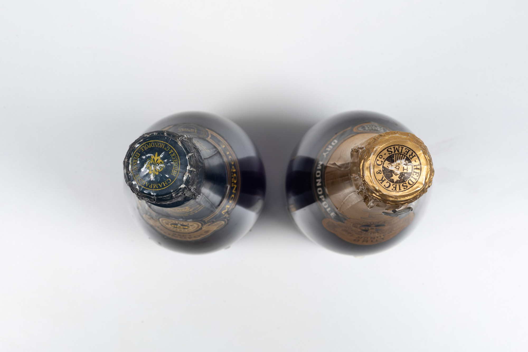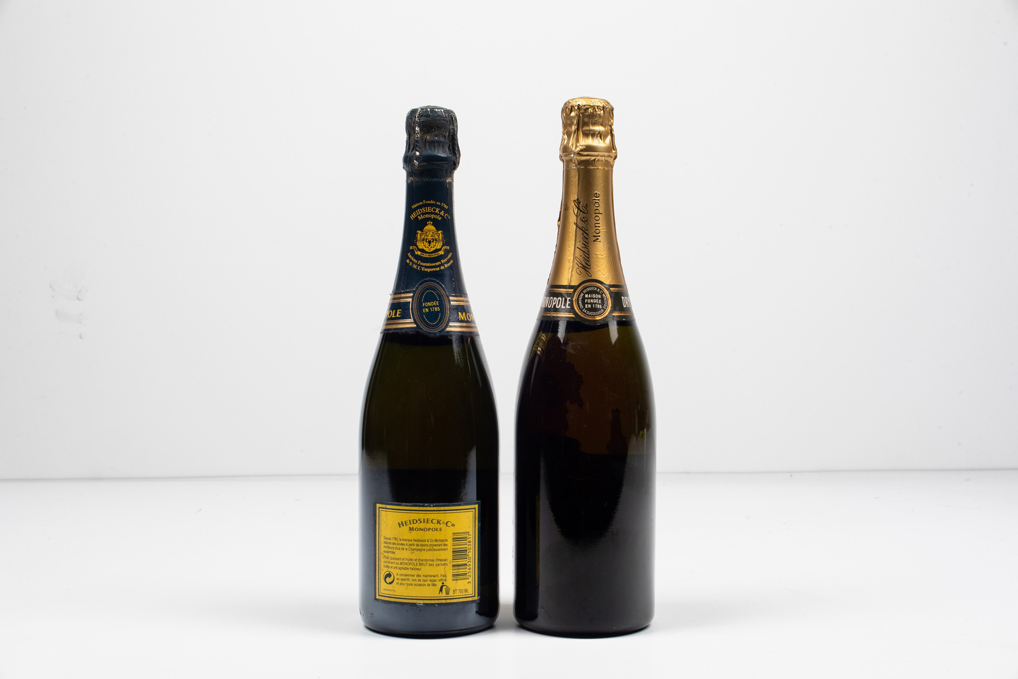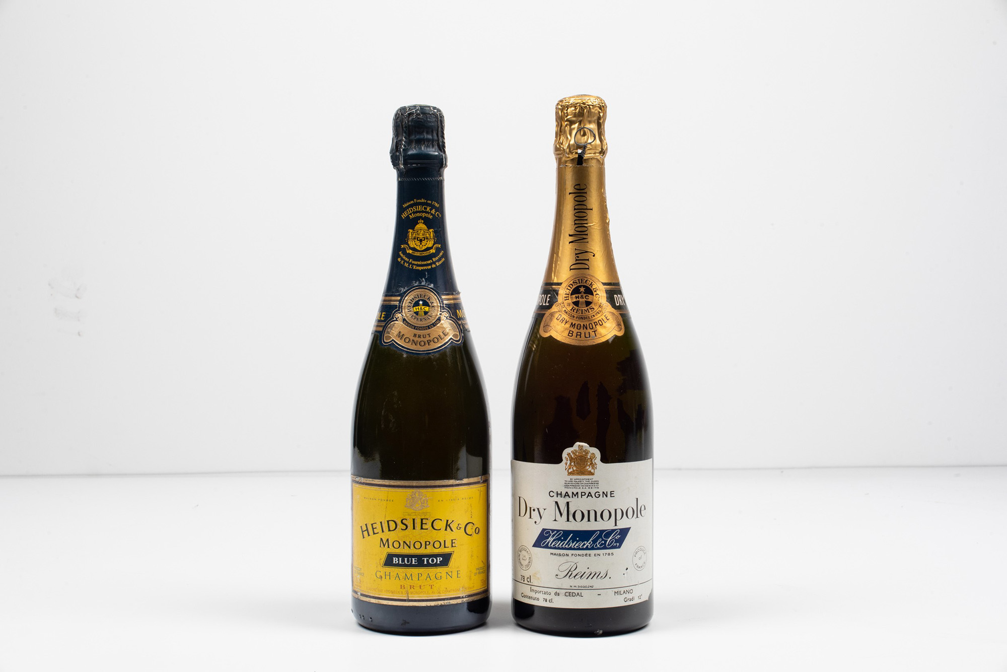 Heidsieck, Champagne Monopole Blue Top Brut Heidsieck, Champagne Dry Monopole, (1 Bt e 1 Bt 78cl), Champagne Monopole Blue Top Brut, 1 Bt TS, Champagne Dry Monopole, 1 Bt BN, (etichette e capsule con segni d'usura del tempo), Champagne Dry Monopole con presenza di deposito
