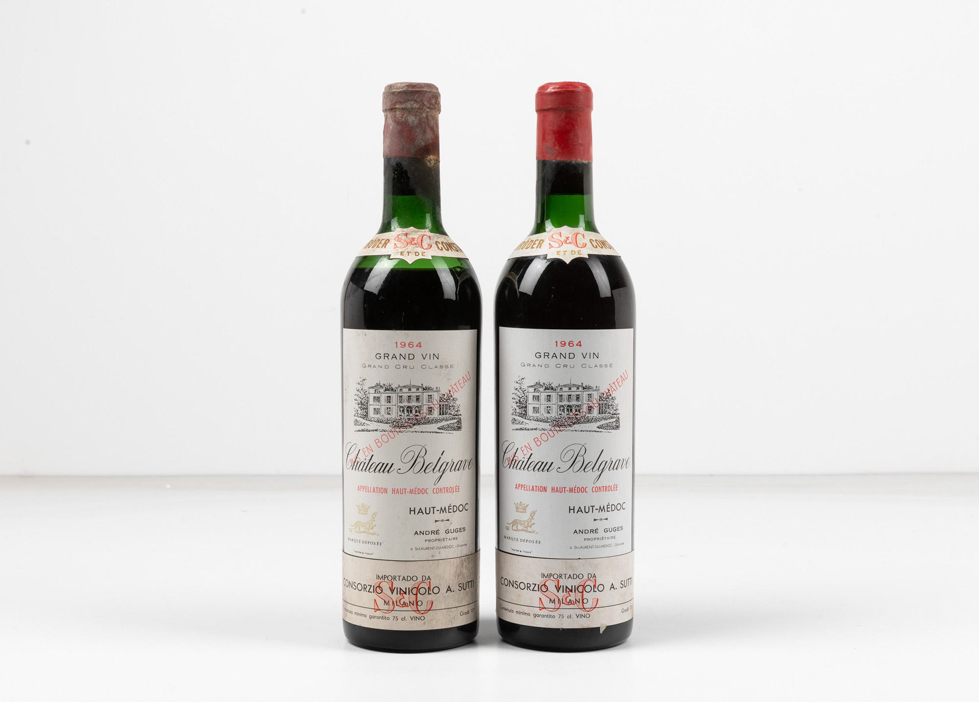 Chateau Belgrave, Haut Medoc, (2 Bts), 1964, 1 Bt TS, 1 Bt S, (etichette con segni d'usura del tempo e capsule danneggiate)