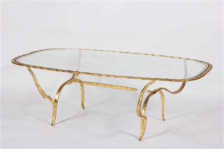 Tavolino. Ferro. Cm 131,00 x 43,00 x 75,00. Tavolino in ferro dorato e piano in cristallo prodotto per Banci, Firenze.