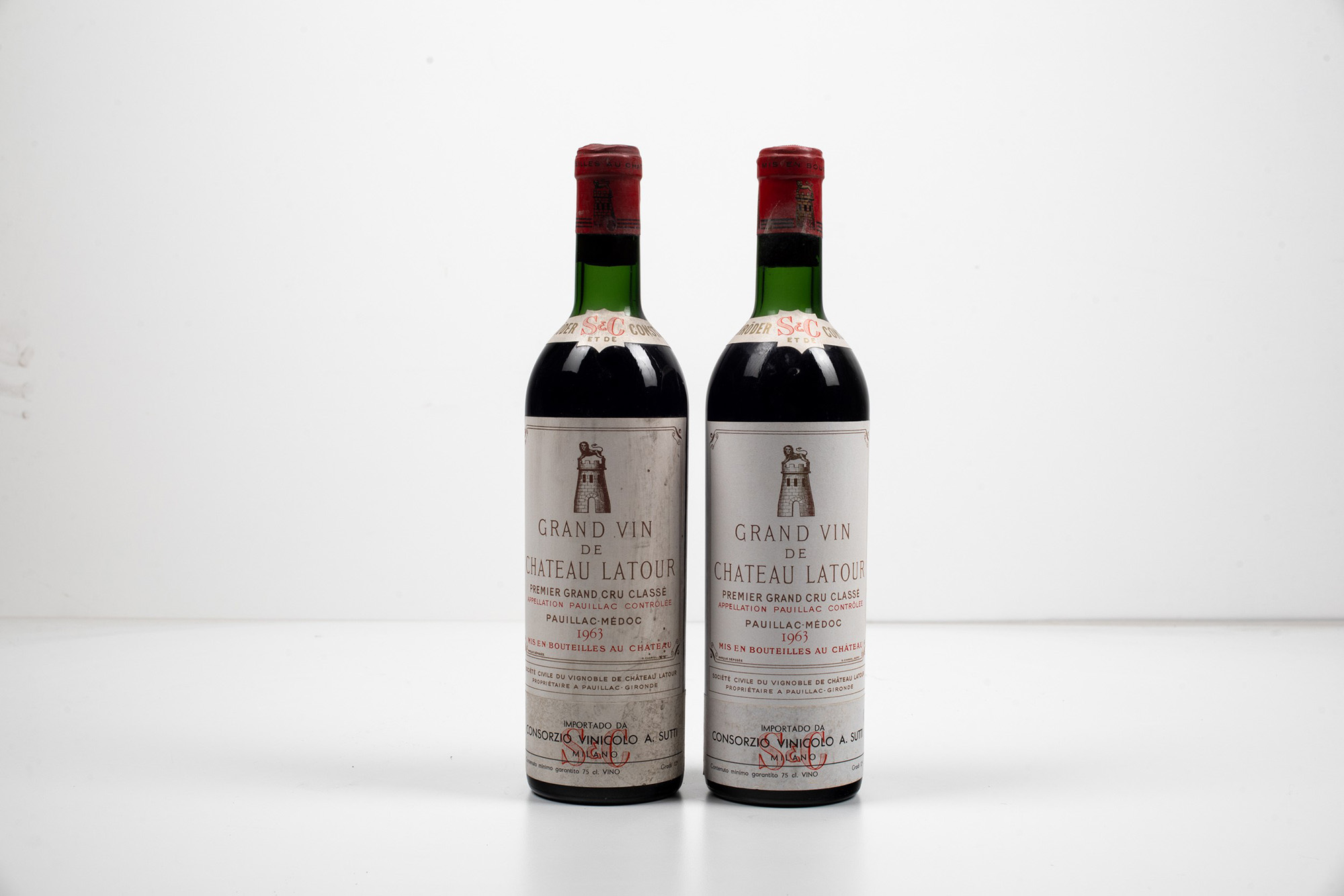 Chateau Latour, Pauillac, (2 Bts), 1963, 2 Bts TS, (etichette e capsule con segni d'usura del tempo)