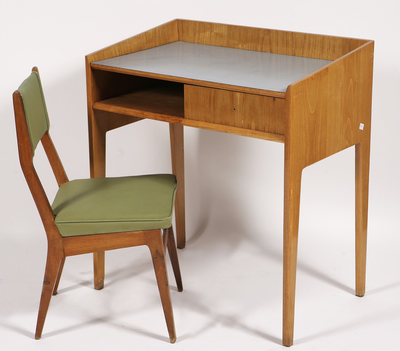 I.S.A. Piccolo scrittoio e sedia. Legno. . Targhetta in ottone sul retro...