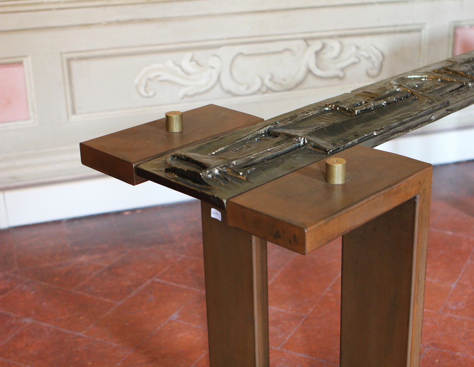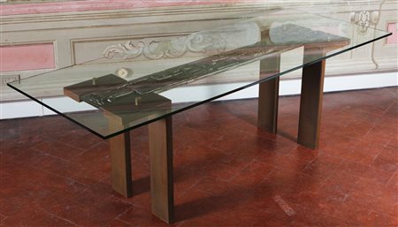 MANIFATTURA ITALIANA DEL XX SECOLO Monumentale tavolo con bassorilievo in alluminio. Alluminio ferro e vetro. Cm 205,00 x 85,00 x 74,00. Anni '80.