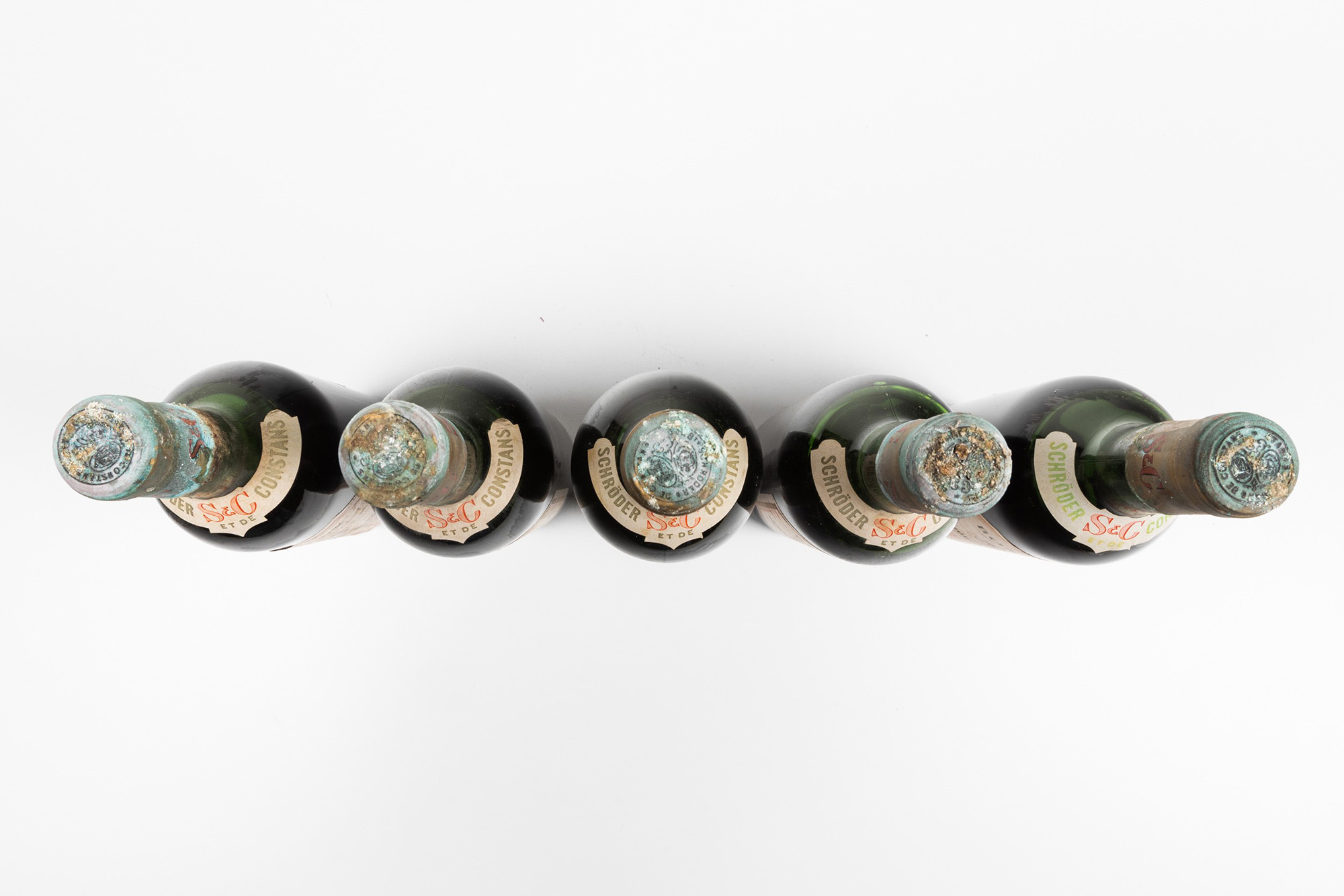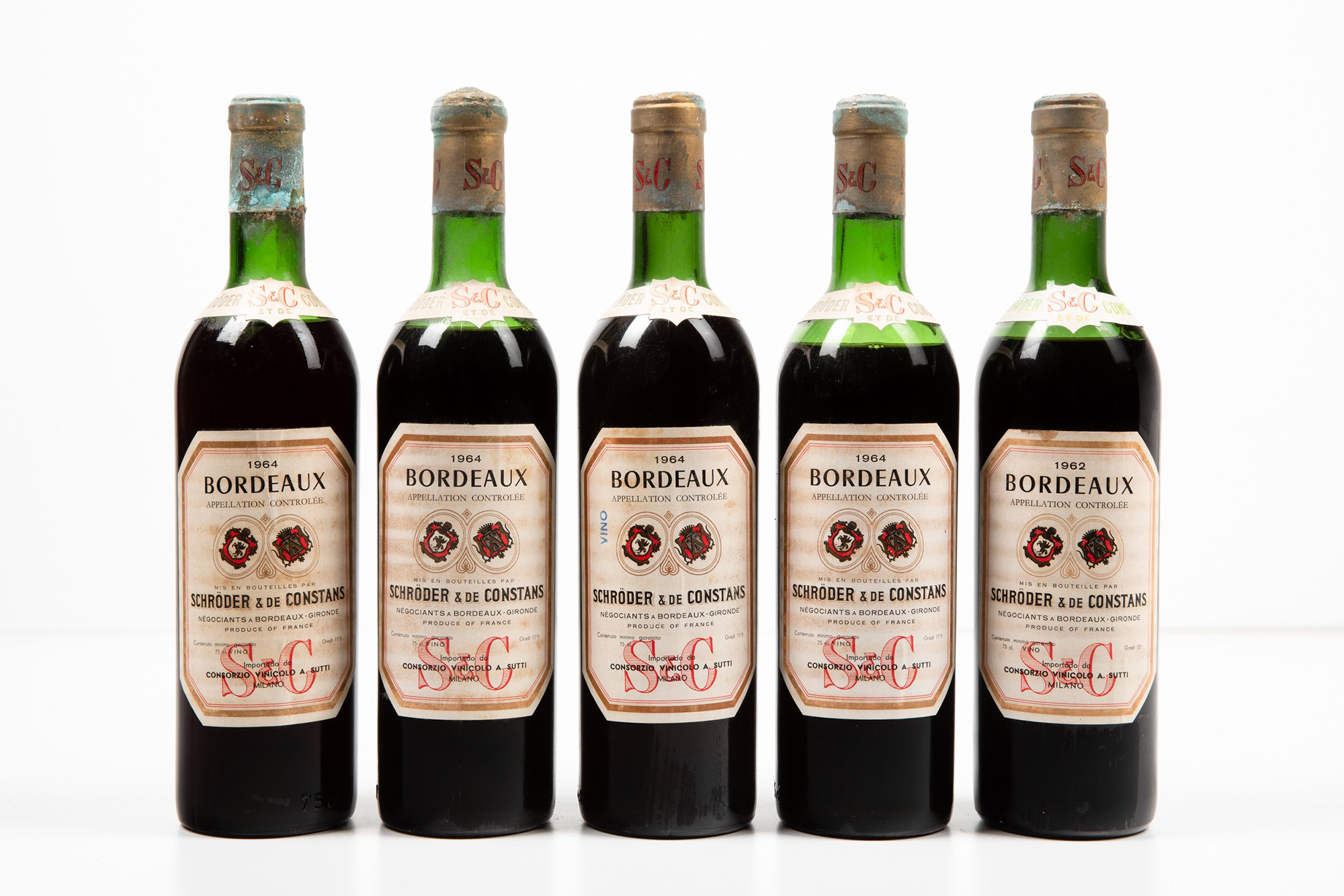 Schroder & de Constans, Bordeaux, (5 Bts), 1964, 3 Bts S, 1 Bt MS, 1962 , 1 Bt MS, (etichette e capsule con segni d'usura del tempo)