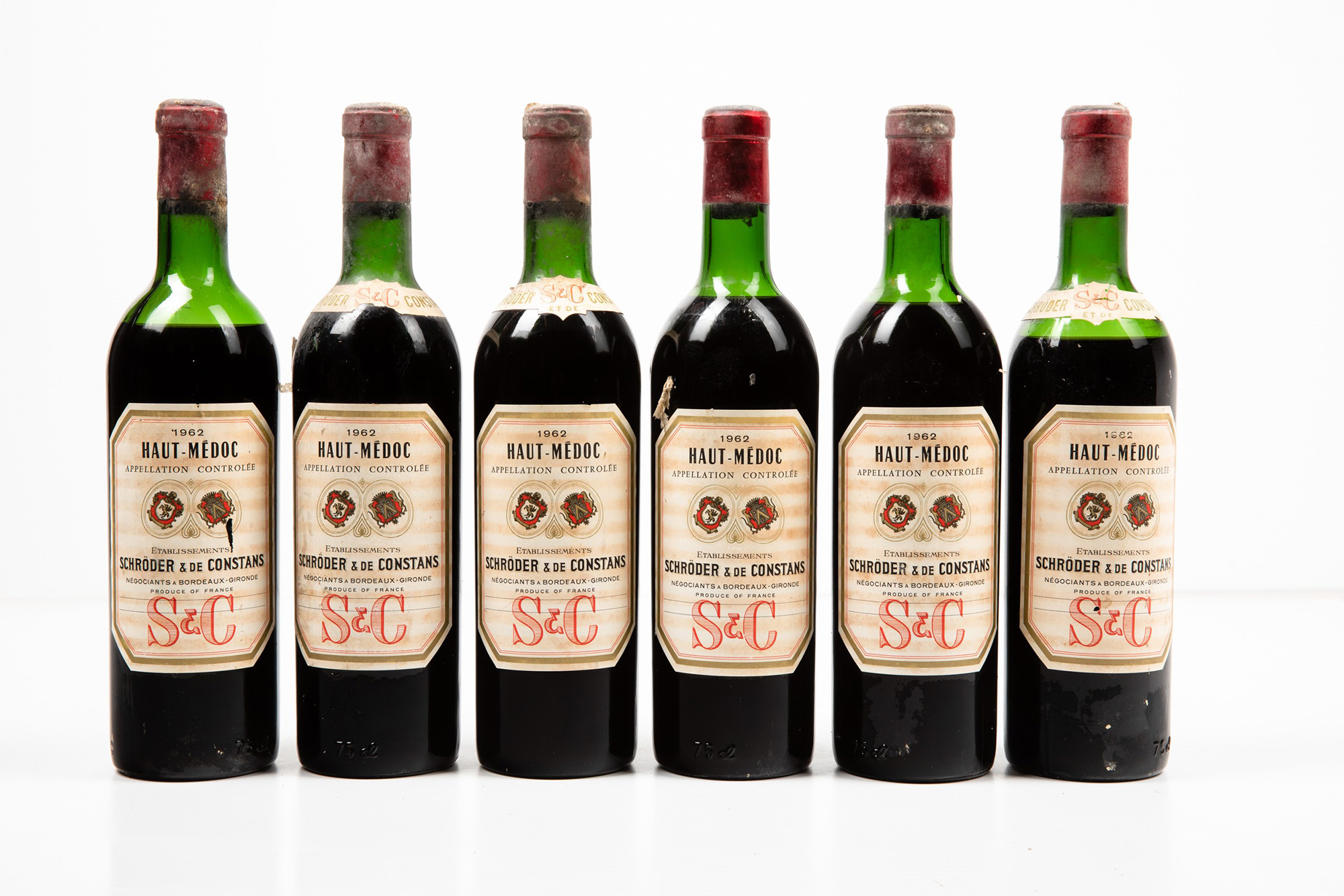 Schroder & de Constans, Haut Medoc, (6 Bts), 1962, 4 Bts S, 2 Bts LS, (etichette e capsule danneggiate), tre bottiglie senza collarino