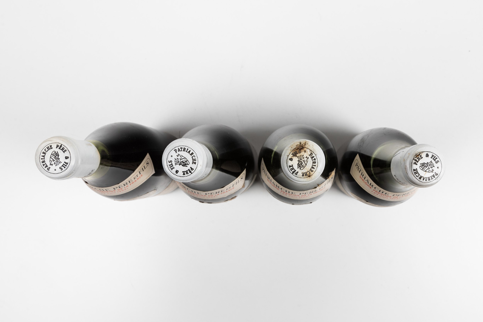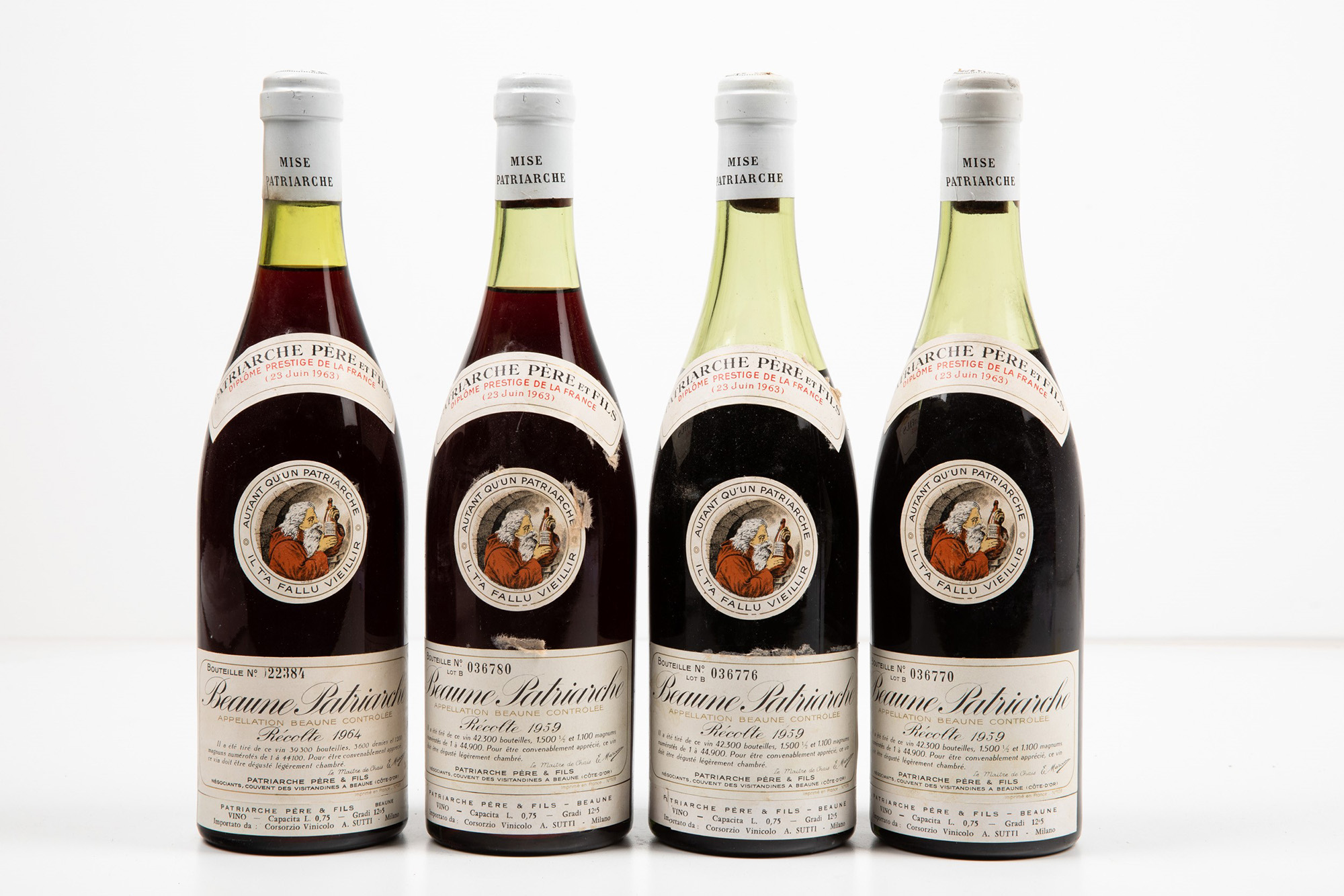 Patriarche, Beaune, (4 Bts), 1959, 2 Bts MS, 1 Bt BN, 1964, 1 Bt WN, (etichette e capsule con segni d'usura del tempo), bottiglie del 1959 nr. 036776, 036770 e 036780, bottiglia del 1964 nr. 22384