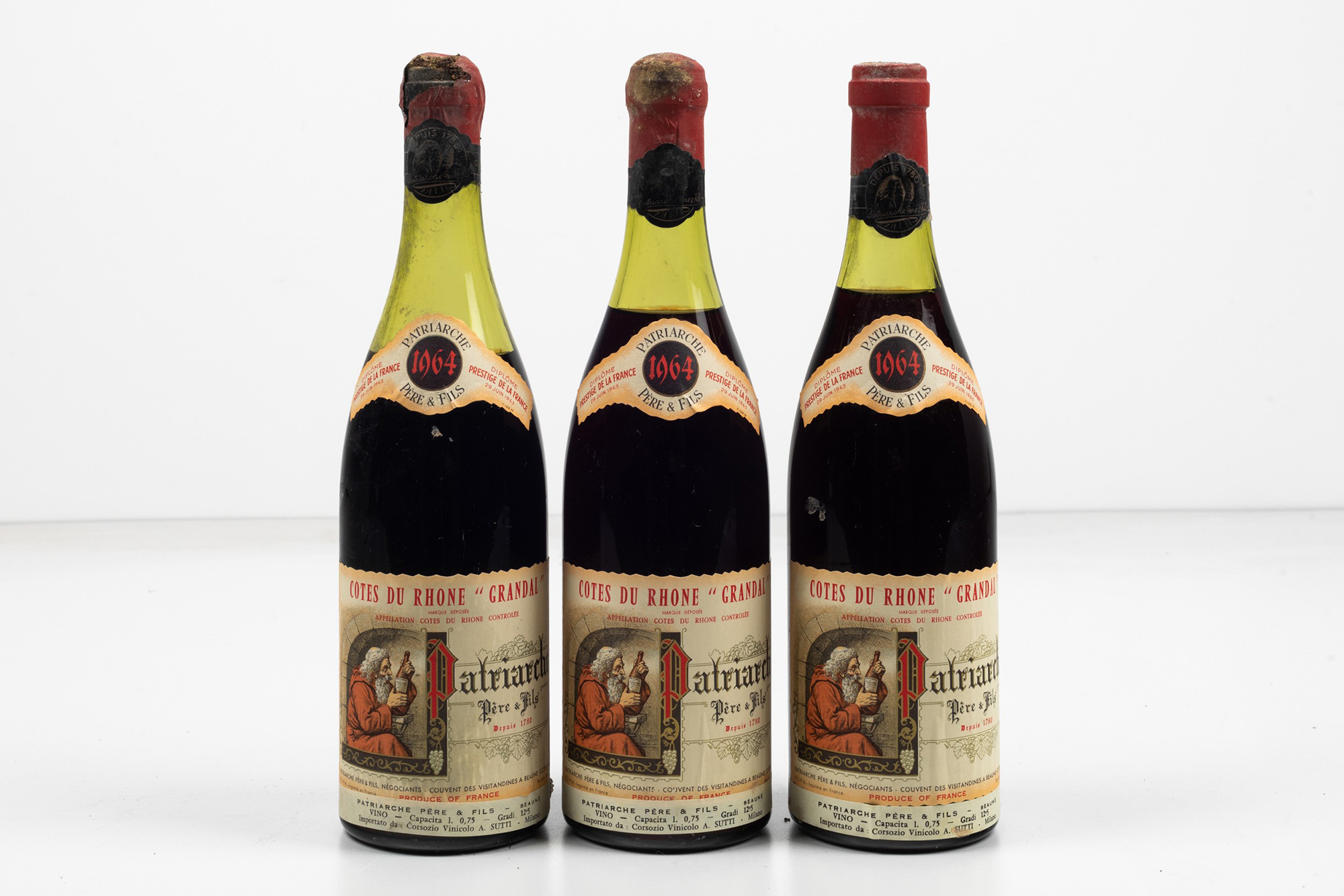 Patriarche, Cotes du Rhone Grandal, (3 Bts), 1964, 2 Bts TS, 1 Bt MS, (etichette e capsule danneggiate)