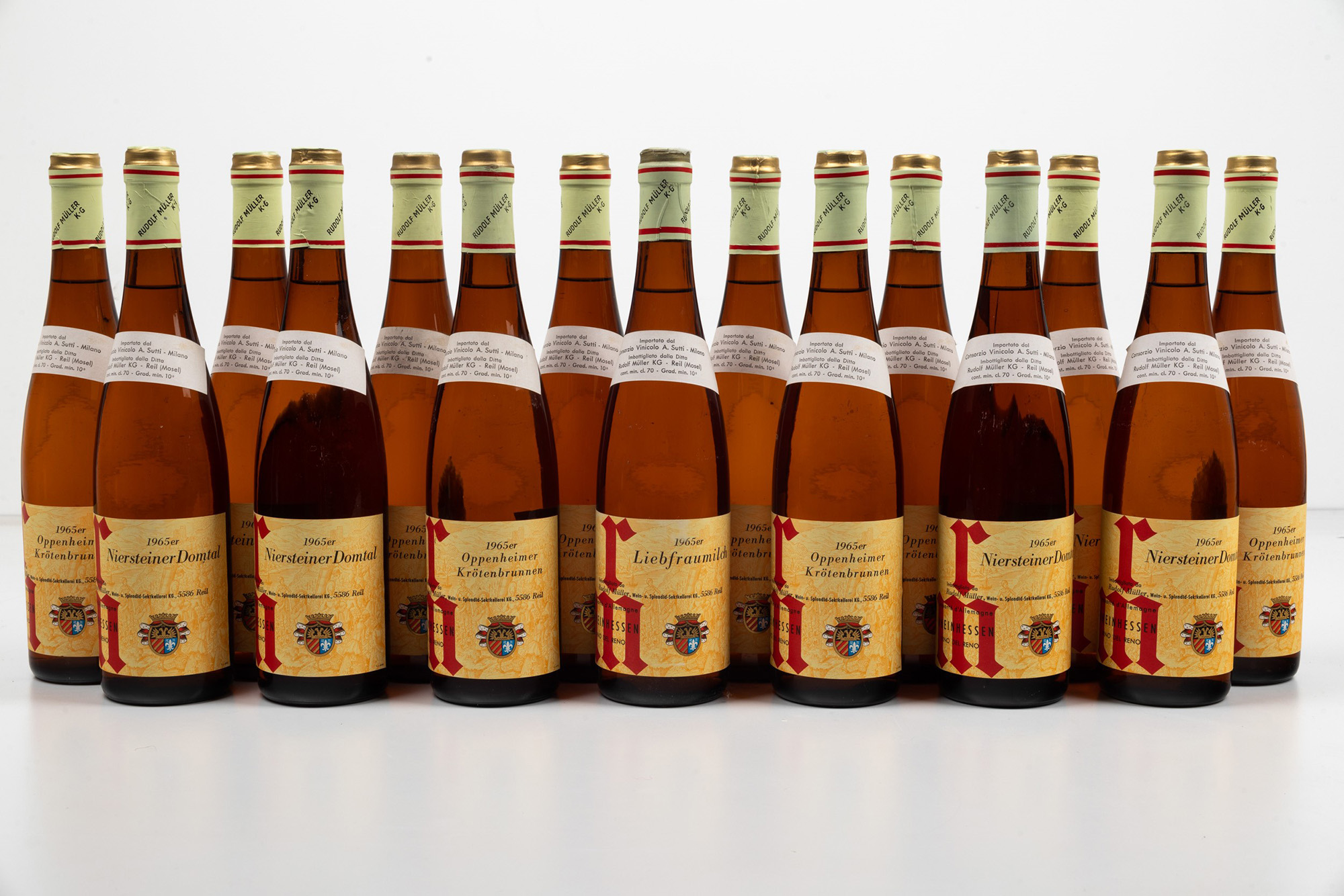 Rudolf Muller, Oppenheimer Krotenbrunnen Rudolf Muller, Niersteiner Domtal Rudolf Muller, Liebfraumilch, (15 Bts), 1965, Oppenheimer Krotenbrunnen, 8 Bts BN, Niersteiner Domtal, 6 Bts BN, Liebfraumilch, 1 Bt BN, (etichette e capsule con segni d'usura del tempo)