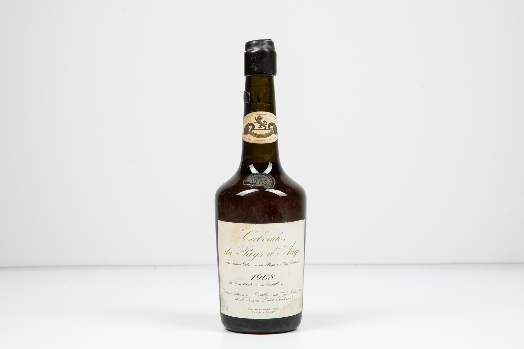 Christian Drouin Domaine Coeur de Lion, Calvados du Pays d'Auge, (1 Bt 70cl), 1968, 42%, 1 Bt TS, (etichetta e capsula con segni d'usura del tempo), distillato nel 1968 e imbottigliato nel 1997, importato da V.E.L.I.E.R. Genova
