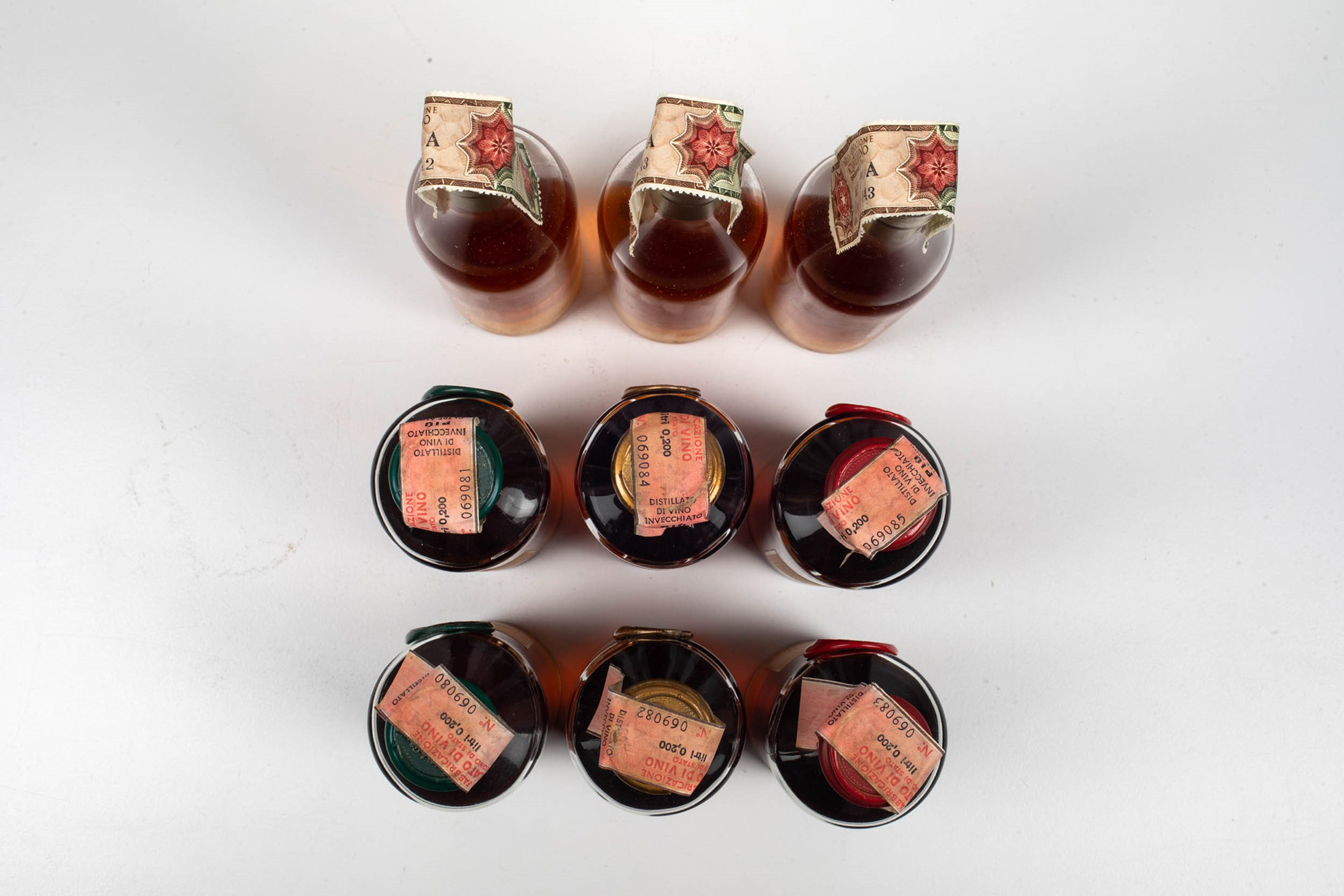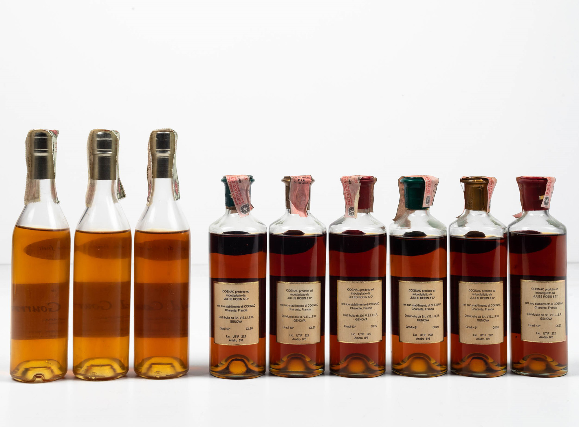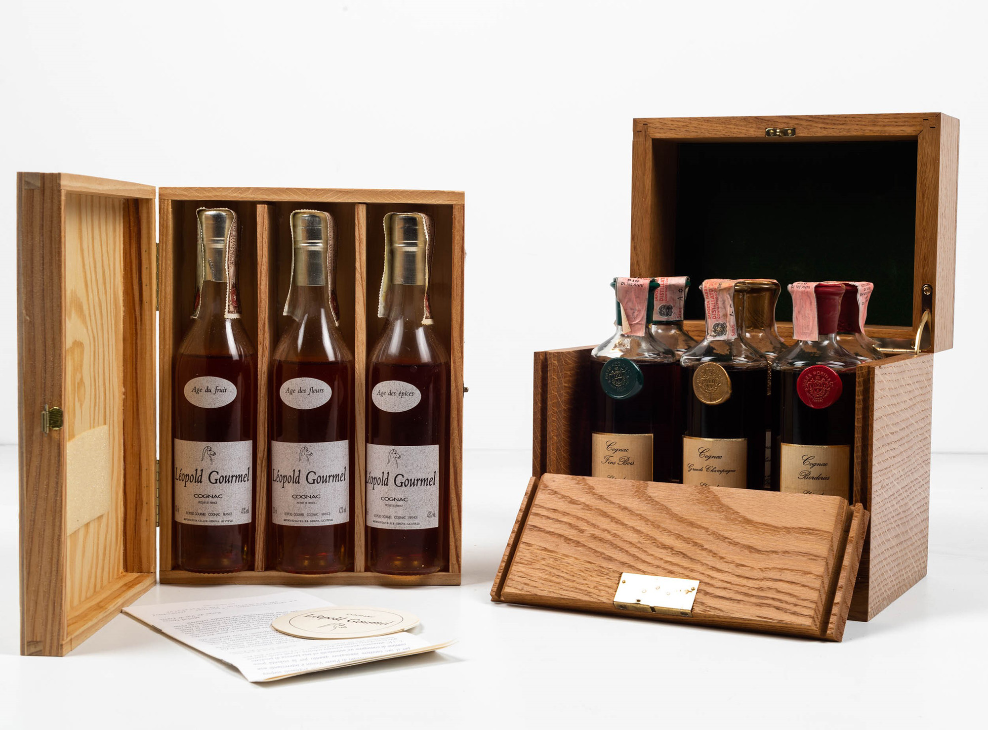 Lèopold Gourmel, Cognac Age du fruit Lèopold Gourmel, Cognac Age des fleurs Lèopold Gourmel, Cognac Age des épices Jules Robin, Cognac Fins Bois Jules Robin, Cognac Grande Champagne Jules Robin, Cognac Borderies, (9 Bts 20cl), 9 Bts LS, Cognac Age du fruit, 41%, Cognac Age des fleurs, 42%, Cognac Age des épices, 43%, OWC con 3 Bts, Cognac Fins Bois, 43%, Cognac Grande Champagne, 43%, Cognac Borderies, 43%, OWC con 6 Bts, (etichette e capsule con segni d'usura del tempo)