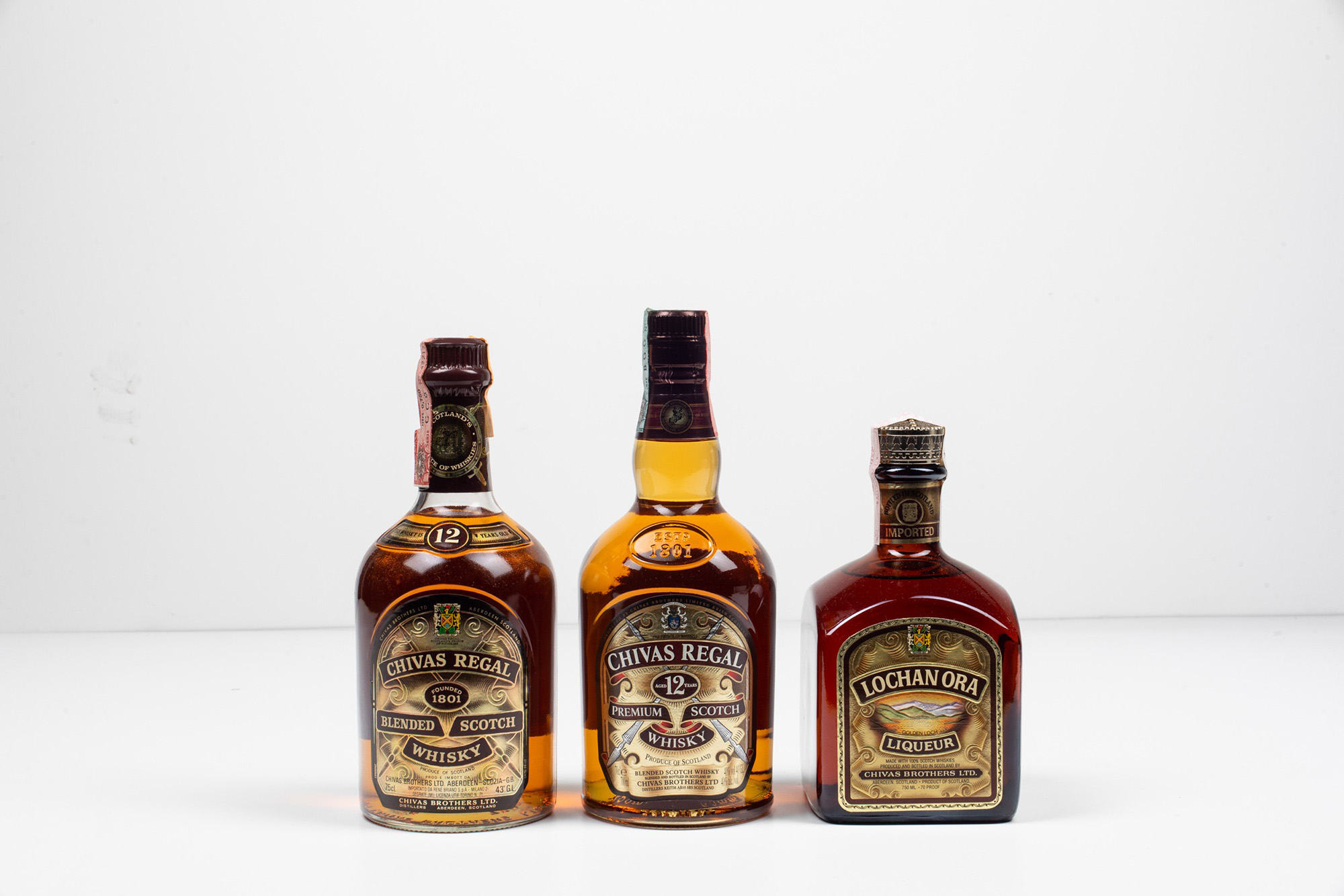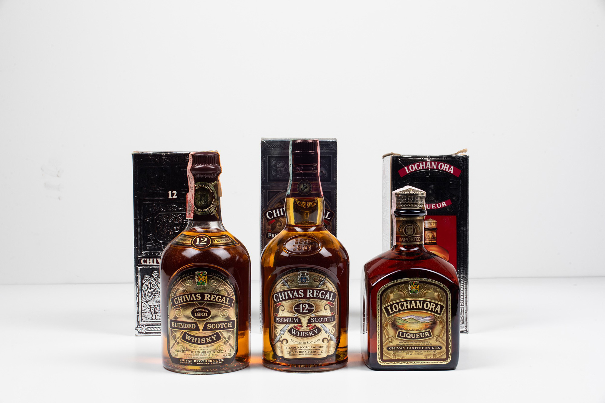 Chivas Brothers, Chivas Regal Blended Scotch Whisky 12 years old Chivas Brothers, Chivas Regal Premium Scotch Whisky 12 years old Chivas Brothers, Lochan Ora Liqueur, (2 Bts e 1 Bt 70cl), Chivas Regal Blended Scotch Whisky 12 years old, 43%, 1 Bt BN, OC, Chivas Regal Premium Scotch Whisky 12 years old, 40%, 1 Bt WN, OC, Lochan Ora Liqueur, grado n.d., 1 Bt TS, OC, (etichette e capsule in ottime condizioni)