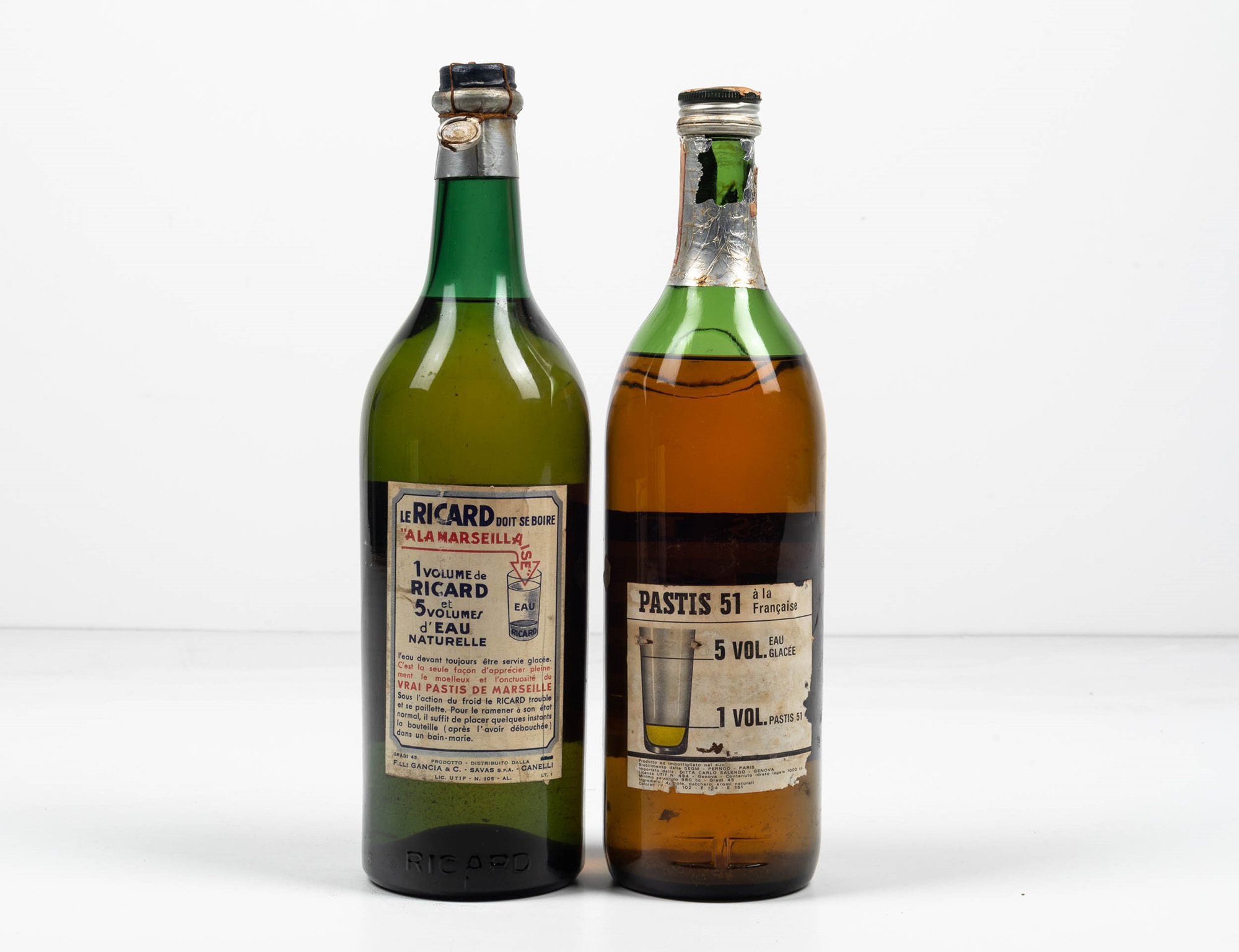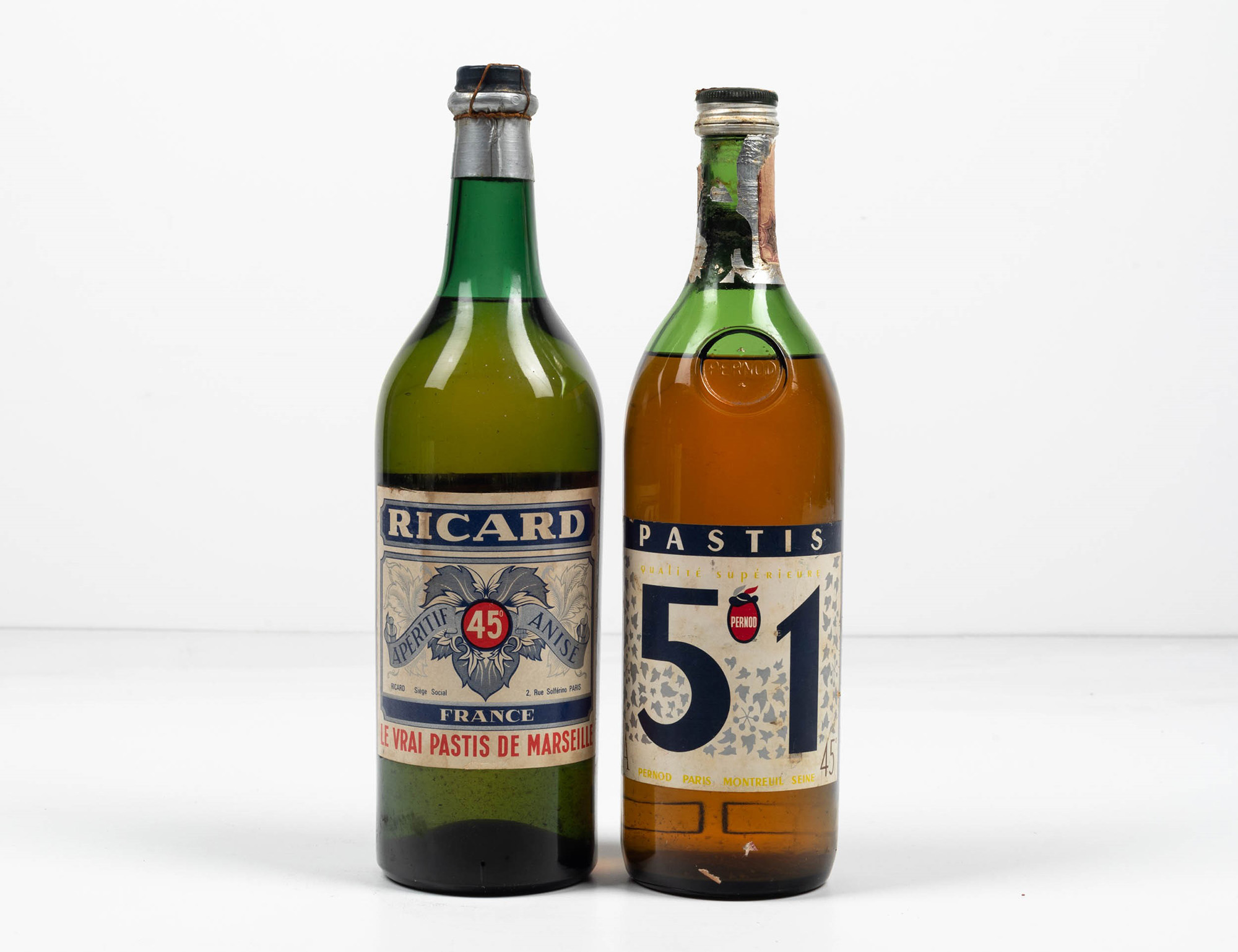 Ricard, Aperitif Anisè Pernod, Pastis, (2 Bts 1L), 45%, Ricard, 1 Bt BN, Pernod, 1 Bt S, (etichette e capsule danneggiate), Ricard sigillo stella (1949-1959), Pastis risalente agli anni 60,