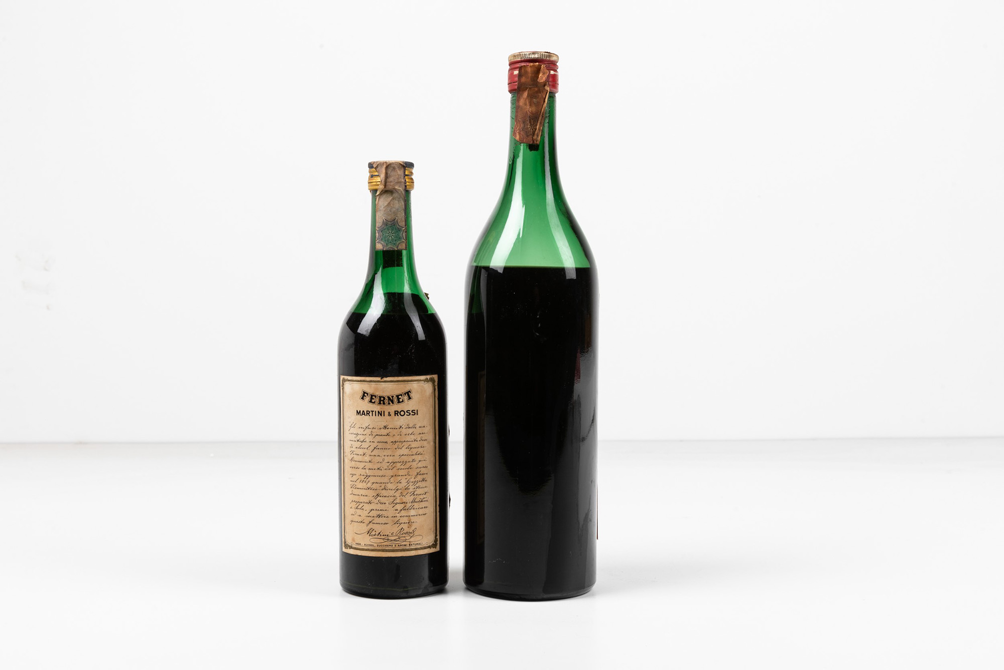 Martini e Rossi, Fernet, (1 Bt 1L e 1 Bt 50cl), 45%, 1 Bt MS, 1 Bt BS, , (etichette e capsule con segni d'usura del tempo), Fernet da 1 L imbottigliato il 07/04/1965