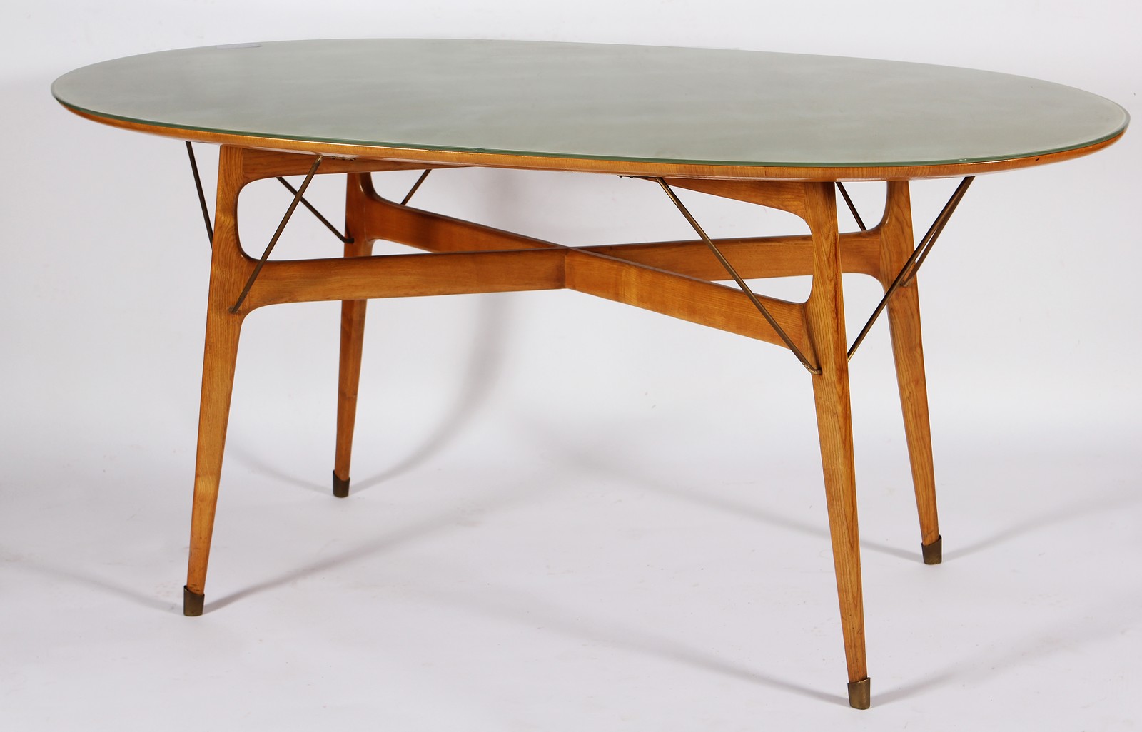 MANIFATTURA ITALIANA DEL XX SECOLO Tavolo in legno di frutto e tiranti in ottone. Legno e vetro. Cm 84,00 x 78,00 x 159,00. Anni '50.