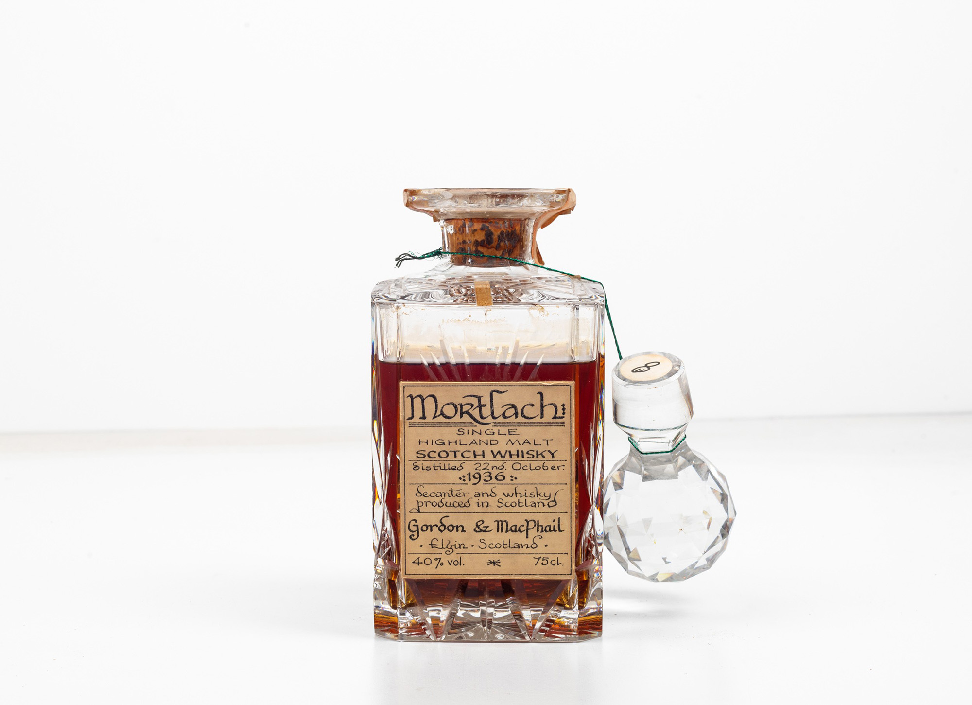Mortlach, Gordon & Macphail Single Highland Malt Scotch Whisky Decanter, (1 Bt), 1936, 40%, 1 Bt MS, (etichetta e capsula con seni d'usura del tempo. Possibili perdite durante il trasporto), distillato il 22/10/1936, importato da Co. Import
