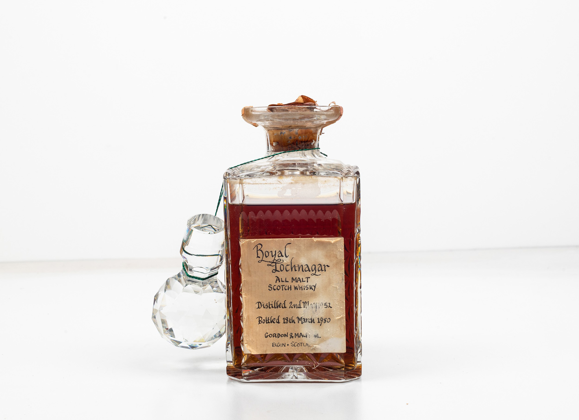 Royal Lochnagar, Gordon & Macphail, All Malt Scotch Whisky Decanter, (1 Bt), 1952, grado n.d., 1 Bt MS, (etichetta e capsula con segni d'usura del tempo. Possibili perdite durante il trasporto), distillato il 02/05/1952 e imbottigliato il 18/03/1980, in decanter