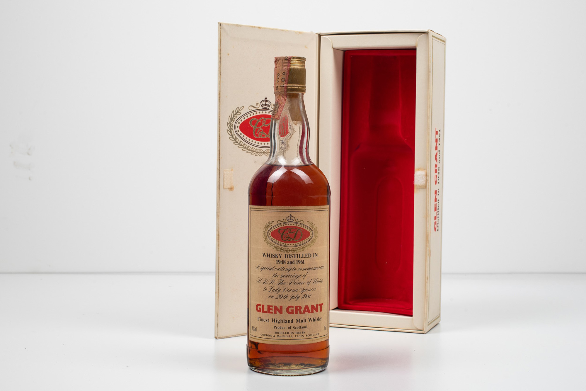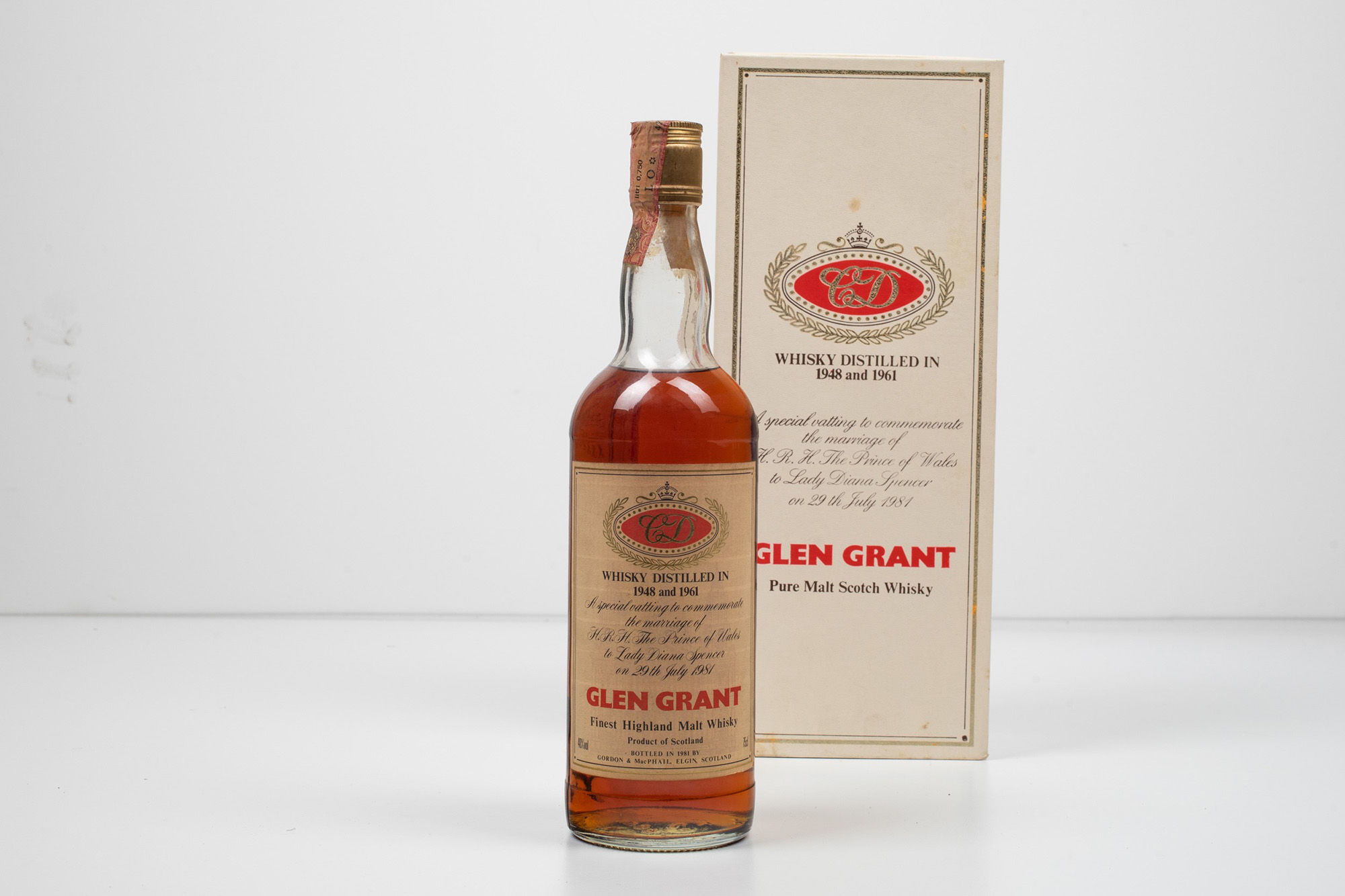 Glen Grant, Gordon & Macphail Finest Highland Malt Whisky, (1 Bt), 1948/1961, 40%, 1 Bt TS, OC, (etichetta, capsula e scatola con segni d'usura del tempo), distillato nel 1948 e 1961, importato da Seagram, edizione speciale per commemorare il matrimonio tra il Principe Carlo e Lady Diana Spencer il 29 luglio 1981