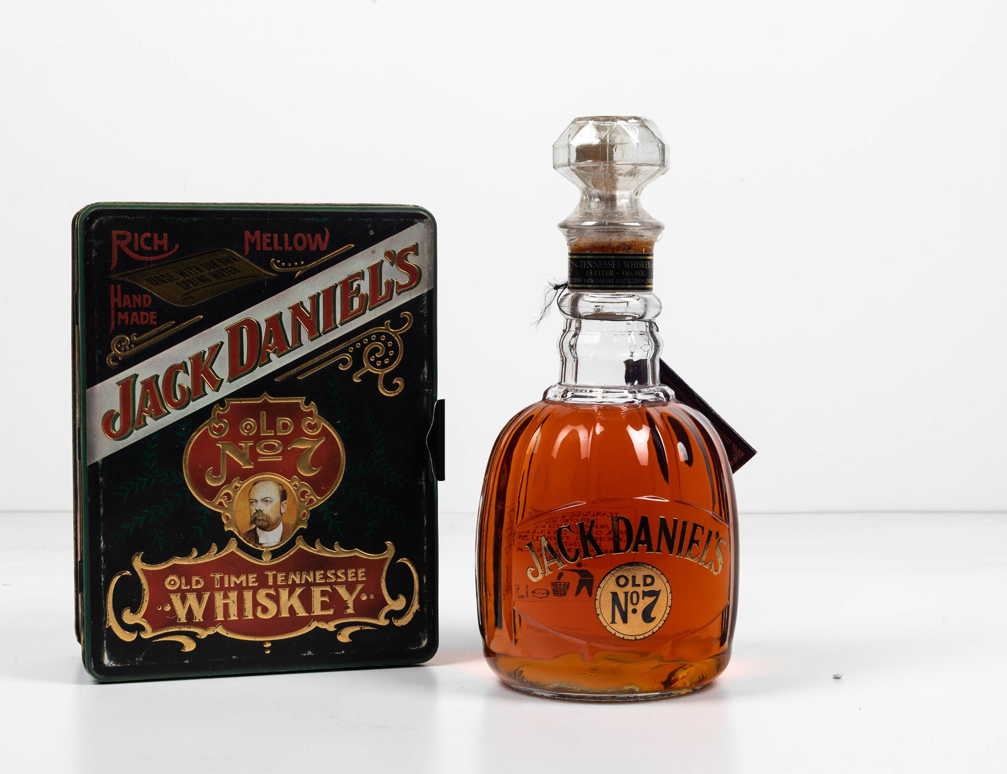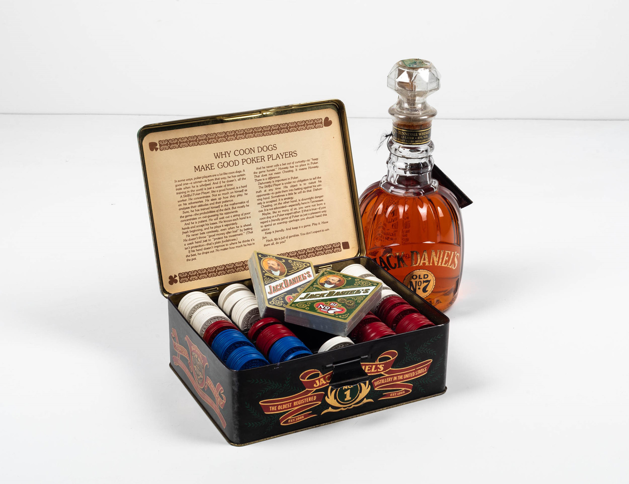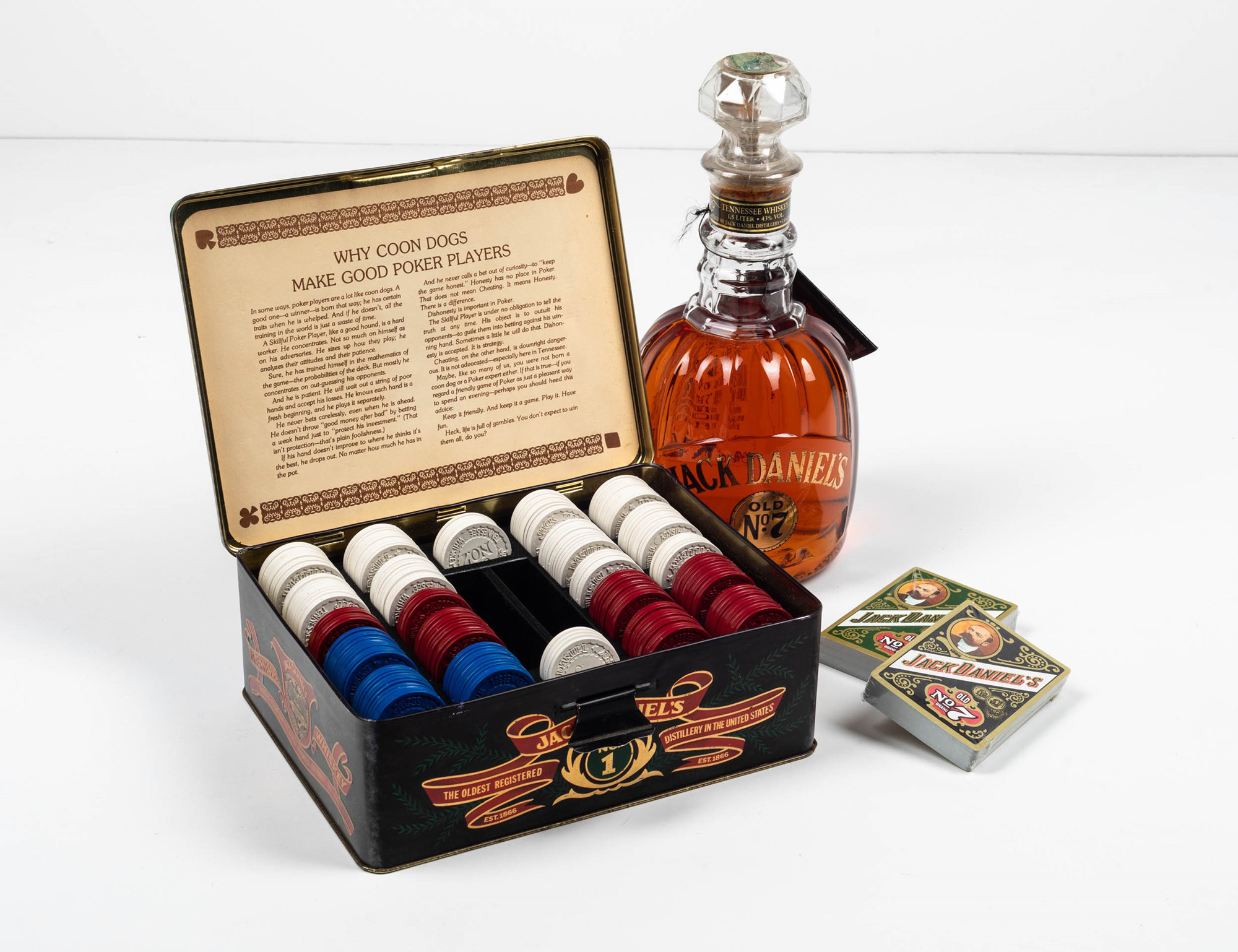 Jack Daniel's, Tennessee Whiskey Old nr. 7, (1 Mg), 43%, 1 Mg TS, OC, (etichetta e capsula con segni d'usura del tempo, distribuito da Martini & Rossi, edizione con latta di fiches e carte da poker