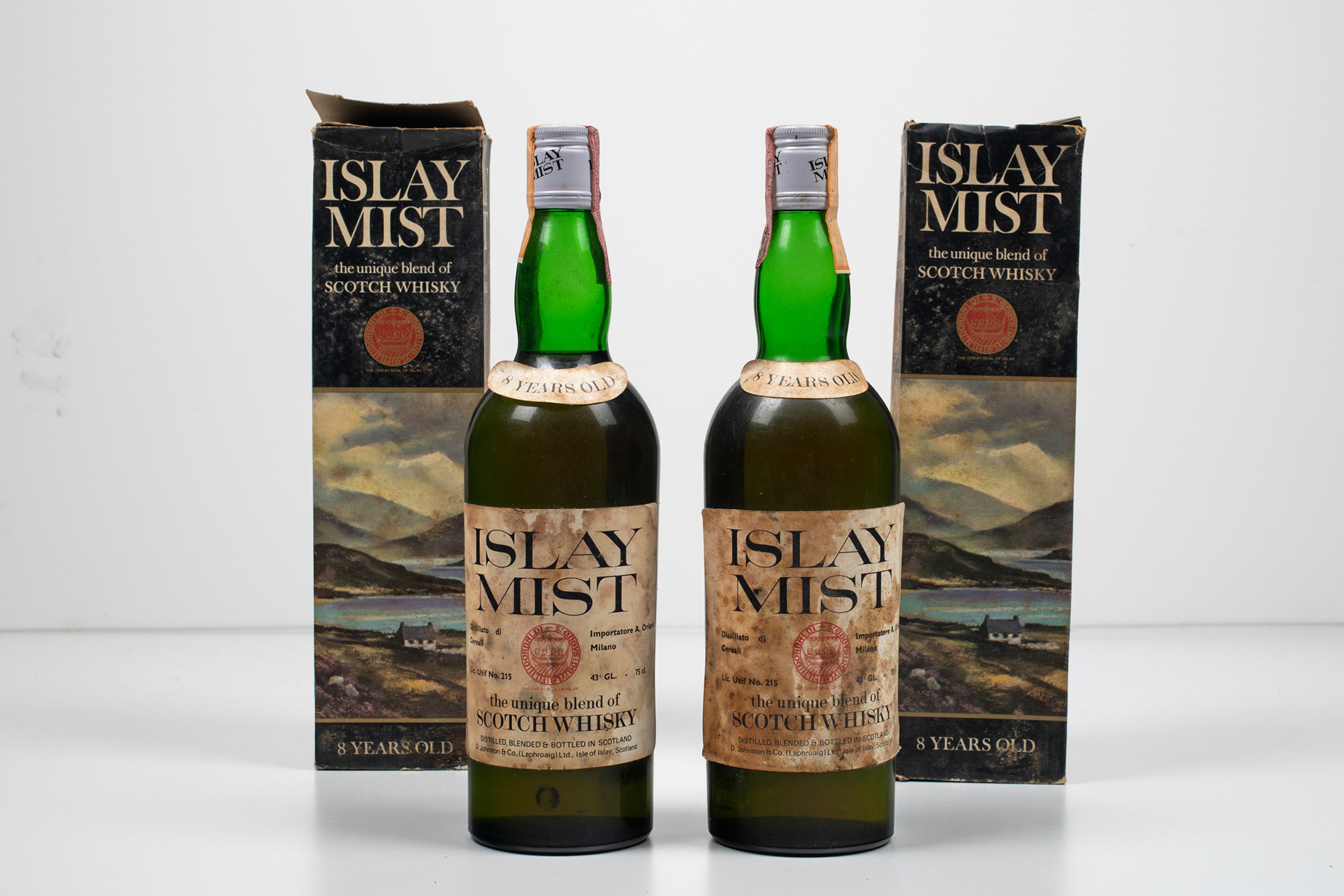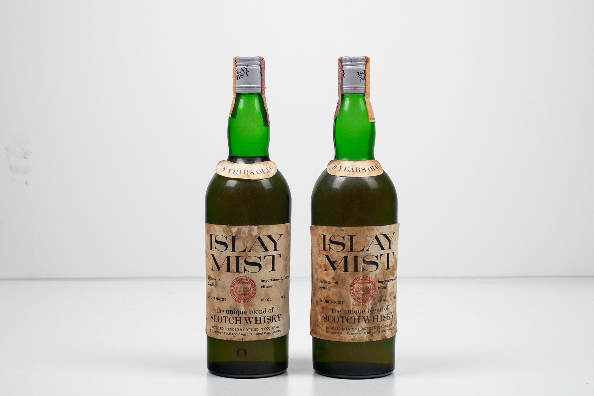 Laphroaig, Islay Mist Scotch Whisky 8 years old, (2 Bts), 43%, 1 Bt TS, 1 Bt S, OC, (etichette, capsule e OC danneggiate), importato da A. Orlandi