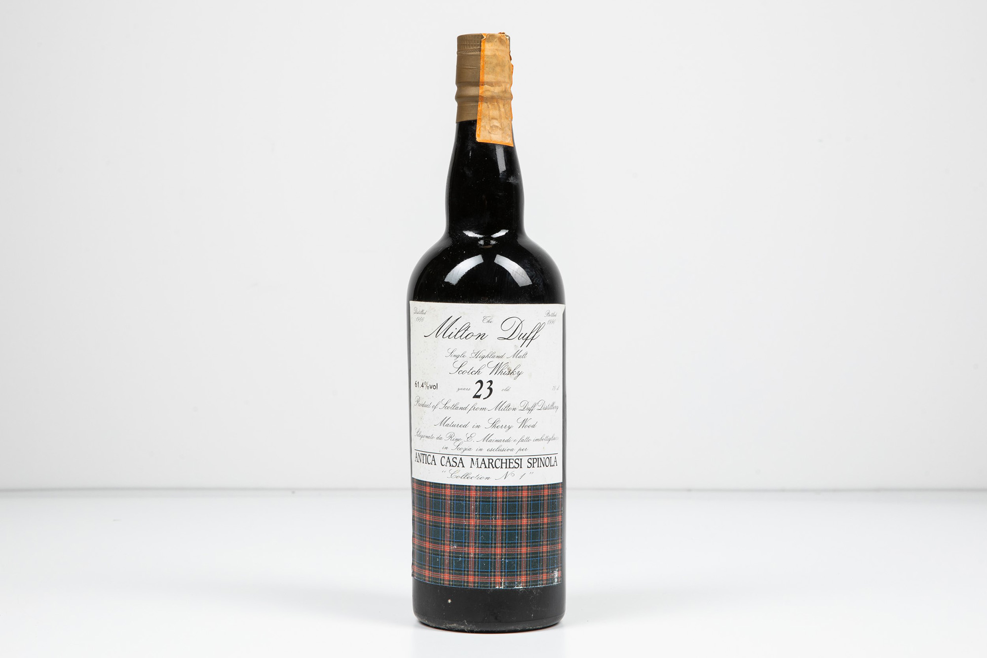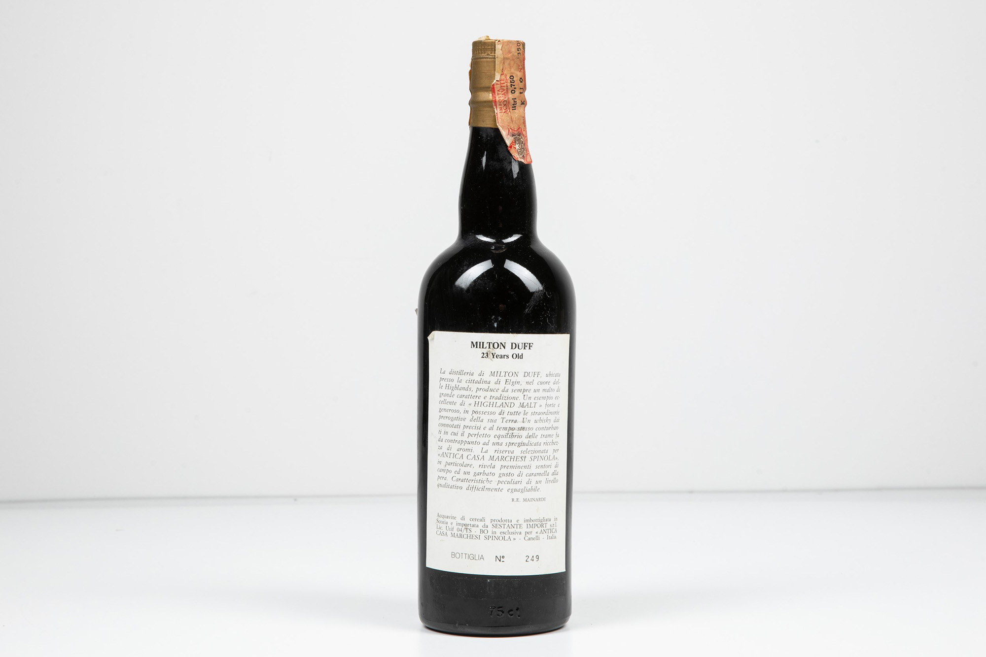 The Milton Duff, Single Highland Malt Scotch Whisky 23 years old, (1 Bt), 1966, 61,4%, 1 Bt TS, , (etichetta e capsula con segni d'usura del tempo), distillato nel 1966 e imbottigliato nel 1990, bottiglia nr. 249, riserva selezionata per "Antica Casa Marchesi Spinola", importato da Sestante import