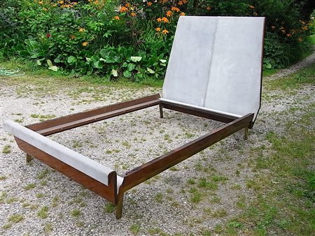 Letto. Legno di noce, pelle e ottone. Cm 240,00 x 135,00 x 118,00. Importante letto per qualità ebanistica ed eccellenti spunti formali evocanti un certo impero lucchese, il tutto risolto in un'idea di modernità. Collocabile tra il 1946 e il 1953, verrebbe da pensare a uno dei pochi mobili disegnati da italo Gamberini a Firenze.