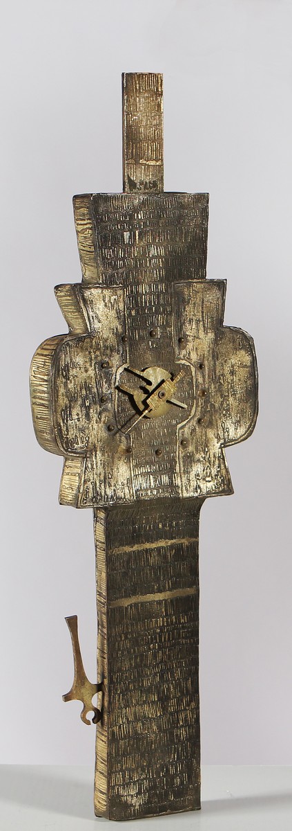 BURCHIELLARO LORENZO (n. 1933) Orologio scultoreo a parete in alluminio con incisioni e interventi alla fiaccola. Alluminio. Cm 21,50 x 69,00 x 4,00. Firma al retro. Non funzionante.